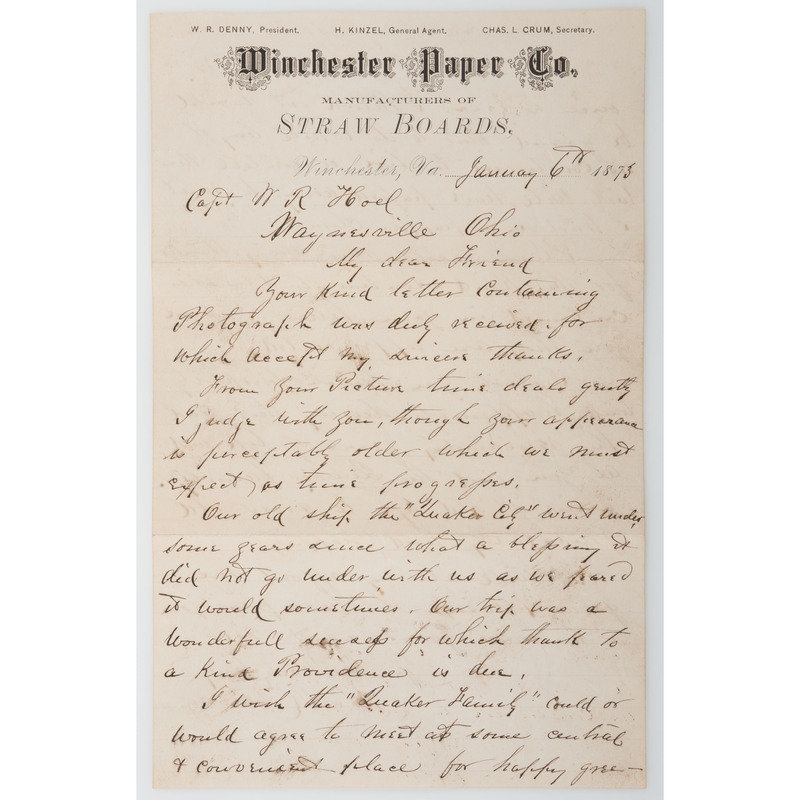 Subsequent to the war, Captain Hoel returned to Waynesville, Ohio, his home just north of Cincinnati. He continued as a steamboat pilot, operated his model farm Kildere, and established himself as a prominent member of the community. Notably, in 1867 Captain Hoel was a passenger on the ship The Quaker City when it embarked upon a months-long pleasure cruise to Europe and Palestine. Among the other passengers on board was Mark Twain whose first book, The Innocents Abroad, was based upon this excursion. An 1873 letter to Hoel from William R. Denny, a fellow passenger on The Quaker City whose diary famously described the voyage, is included in the archive.