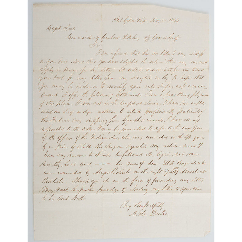 The letters in the archive primarily span 1863-1865 and are written to Captain Hoel. While the correspondence does not include details of Hoel's most intrepid military actions, it does paint a fascinating picture of his role as a military commander in Southern territory. Letters in the collection indicate that Hoel had responsibility for distributing mail across North/South lines and through Union-held Southern territory. Many correspondents are southerners asking for his assistance. Writing on May 31, 1864, to "Capt. Hoel / Commander of Gunboat Pittsburg off Grand Gulf," one doctor implores the commander to modify his rule "that any one must apply in person for his letter.... I am not in the Confederate Service," the doctor continues, "I have been called on in some half a dozen instances to attend professionally patients of the Federal Army suffering from gunshot wounds. I have always responded to the calls." Among other inquiries, Hoel is called upon to assist a POW, to allow bodies to be retrieved under a flag of truce, and to help civilians in personal matters.