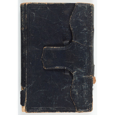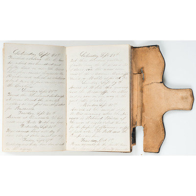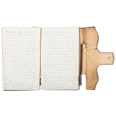 Leather diary contained in a notebook, 4 x 6 in., with flap closure, wallet pocket in rear, identified to James D. Nixon. Entries begin in December 1859, with the first 13pp from the early period. War-date entries begin in July 1861.