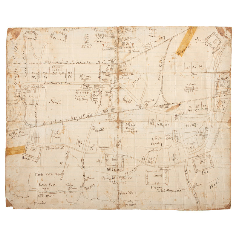 Pen and ink map, 12.5 x 15.25 in., on two sheets of notebook paper laid on cigar paper. A highly detailed map showing the position of each regiment present at Suffolk, as well as the locations of Union sharpshooters, batteries, hospitals, breastworks, garrisons, churches, and cemeteries. The Seaboard & Roanoke and Petersburg & Norfolk Railroads are also identified. Belonged to George William Gragg, a private with Company K, 6th Massachusetts Infantry, son of William Francis Gragg, also a Civil War veteran with a storied naval career. The map was purchased from John H. Keith nine days after the Siege of Suffolk was raised, as inscribed on the back (“John H. Keith, Co. C 6th Mass Regt. / Suffolk VA. 1863 / Bought by G.W. Gragg of him / May 13, 1863 for 37 cts”).
