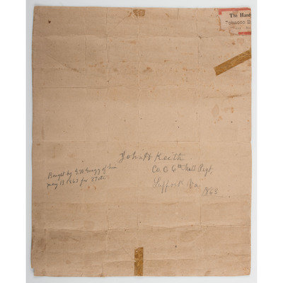 After the siege, George wrote a letter to his wife, Lizzie, and a receipt of sorts for this letter is included in the lot, placing George at Carrsville, Virginia on May 16, 1863, immediately following the Battle of Holland House. The purported cartographer John Keith, who had worked as a civil engineer prior to his enlistment, sold the hand-drawn map to George just before the engagement began. Keith sustained injuries in the battle and died of his wounds on May 16. George returned to Massachusetts upon the expiration of his term of service, only to re-enlist in the Navy in 1864.