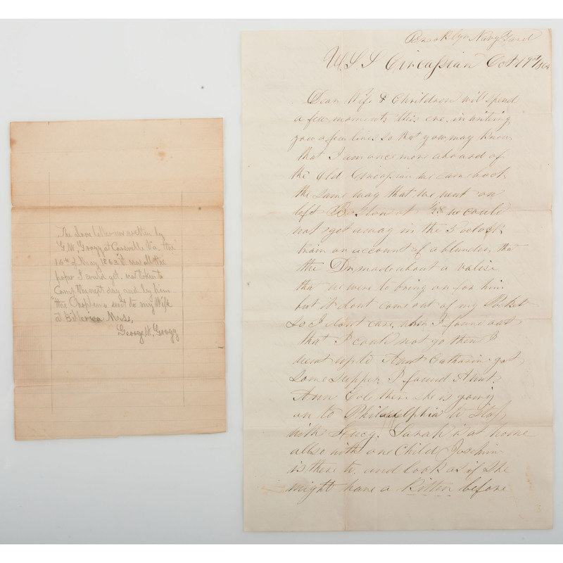This lot also includes three of George’s letters written aboard the USS Circassian, his discharge papers, and five letters written by William Francis Gragg, 1853-1863, including mention of his work as an anonymous naval correspondent for the The Herald.