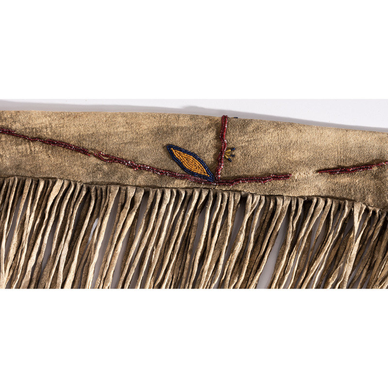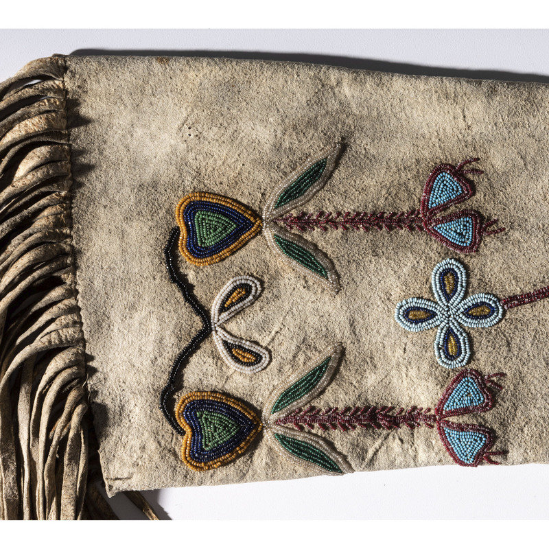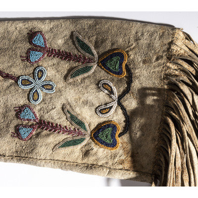 sinew-sewn and beaded using small cut glass beads in colors of light blue, rose, pumpkin, cobalt, translucent green, black, and clear; long fringe at opening and along lower edge