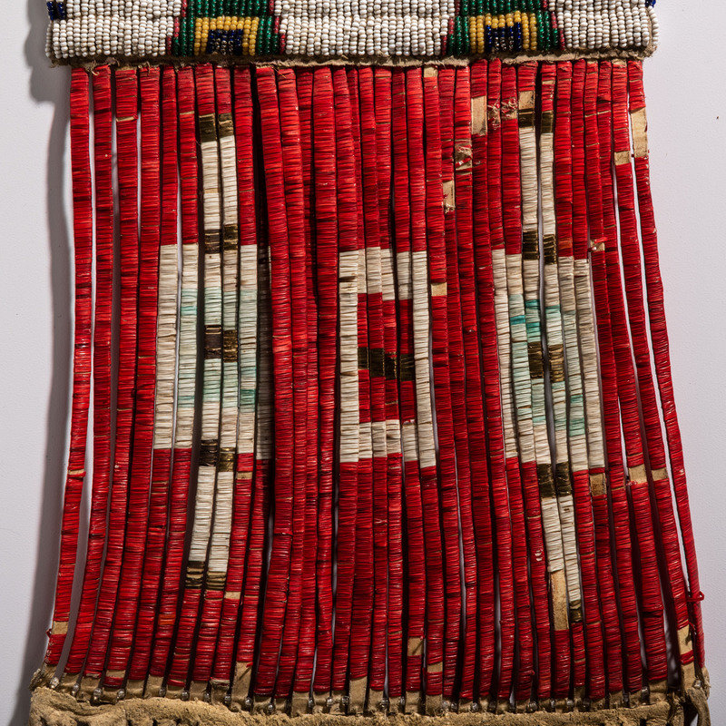 thread and sinew-sewn, with glass beads in colors of red white-heart, cobalt, greasy yellow, cut brass, and white; American flags are placed on both sides of the bag; tin cones filled with red horsehair