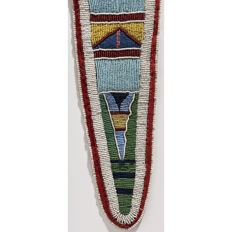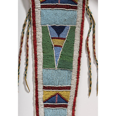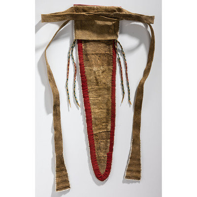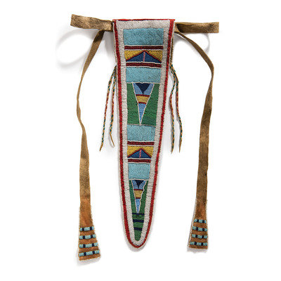 thread and sinew-sewn; with glass beads in colors of red white-heart, light and medium blue, greasy yellow, pink, green, and white; red wool cloth borders beadwork on triangular tab; rectangular bag with beaded embellishments