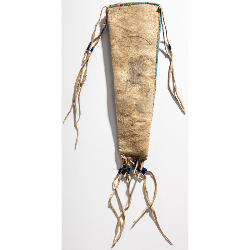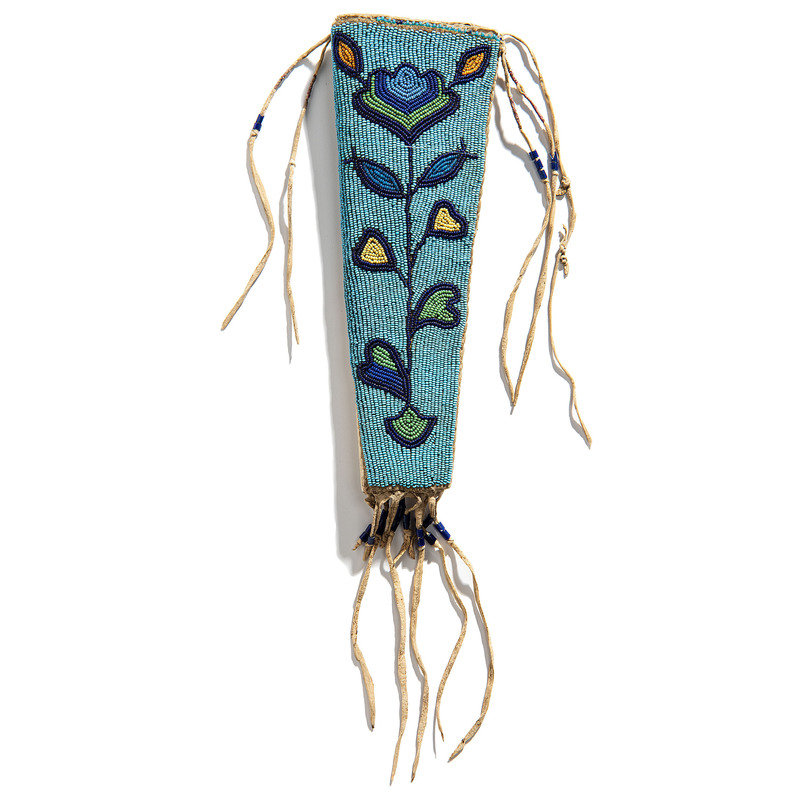 thread-sewn and beaded in a floral motif using colors of pea green, apricot orange, yellow, periwinkle, and various other shades of blue, fringe wrapped with red dyed quills and blue bugle beads; lined with rawhide; overall length 15.25 in.