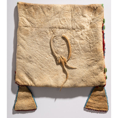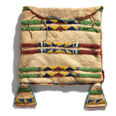 thread-sewn and beaded using colors of greasy yellow, pea green, red, red white-heart, blue, teal, and white and having triangular drops; length 8.5 in.