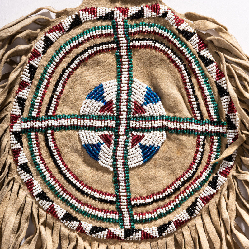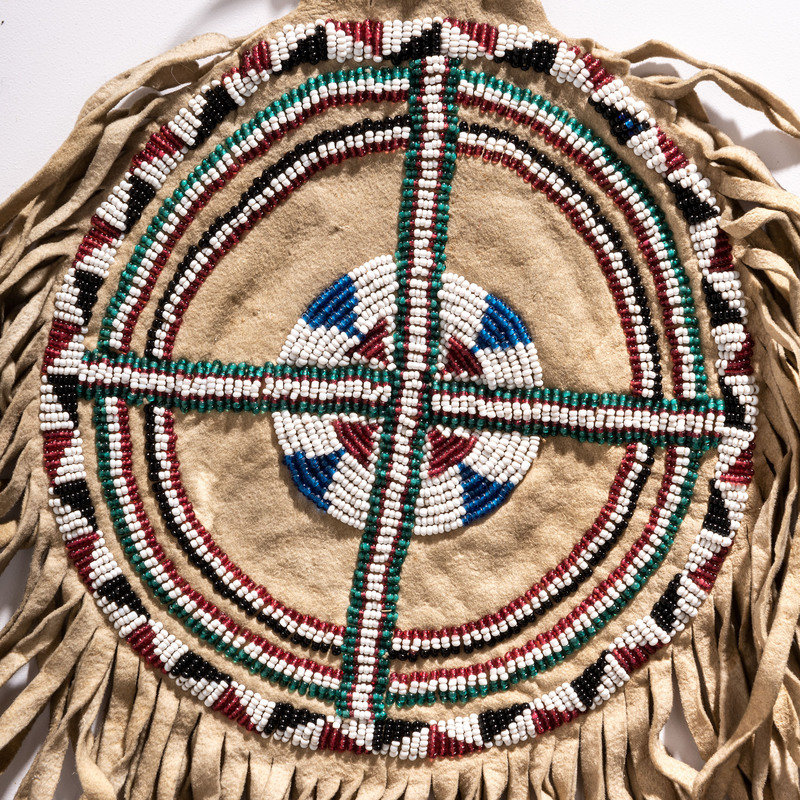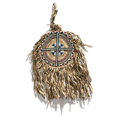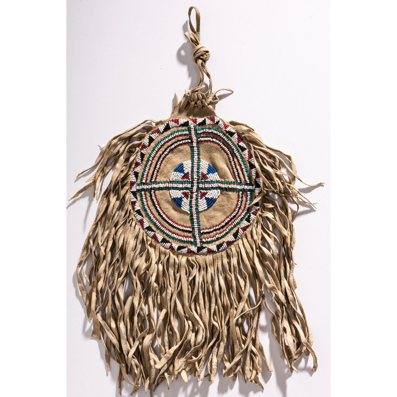 bag made of softly-tanned hide and decorated on both sides with concentric circles of glass beads in rose, black, white, translucent green, and translucent blue, possibly representative of the Sacred Hoop; drawstring closure