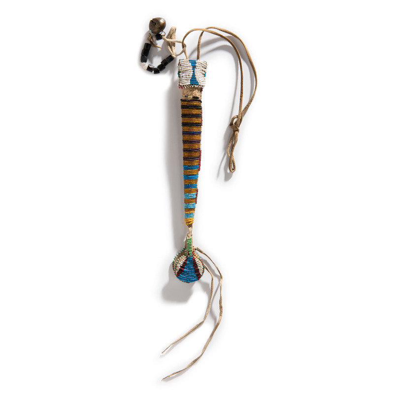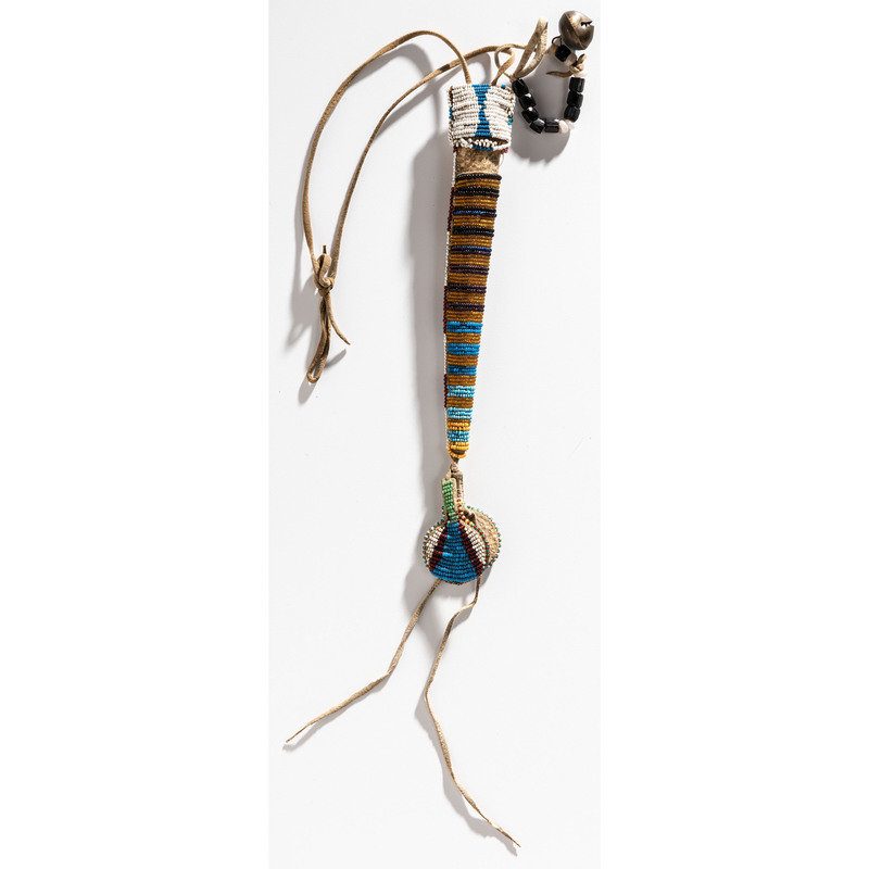 sinew-sewn and beaded using colors of back, amber, greasy blue, light blue, white, and pink; circular drops; brass bell