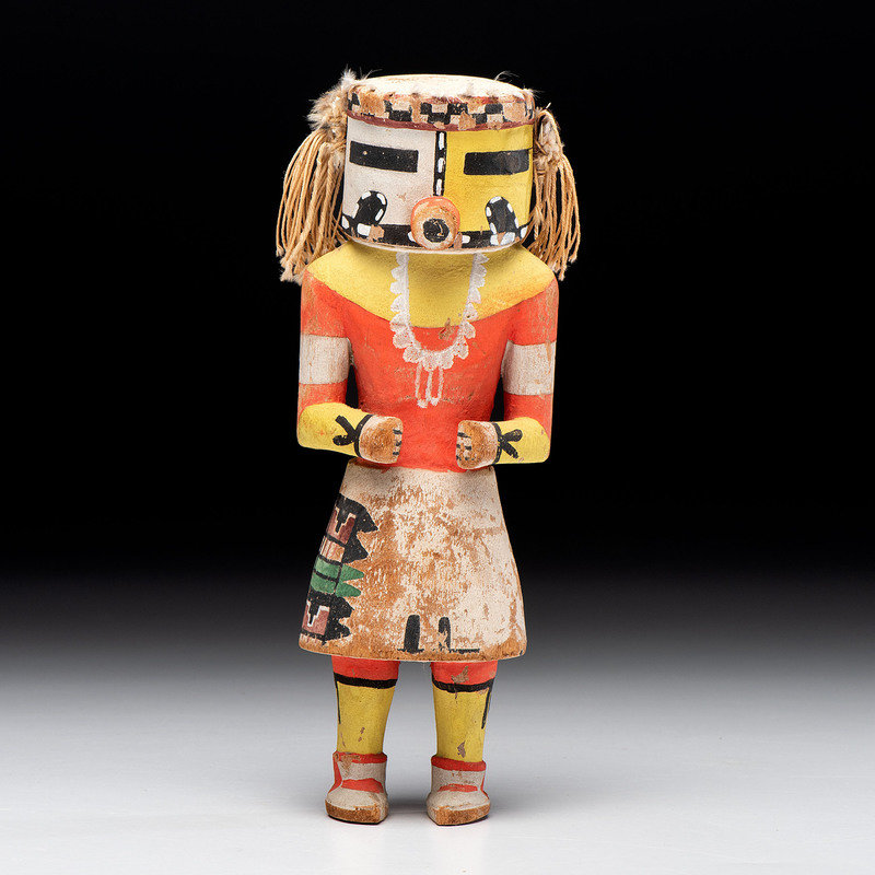 painted in bright colors of yellow, orange, and white; cotton cord at ears