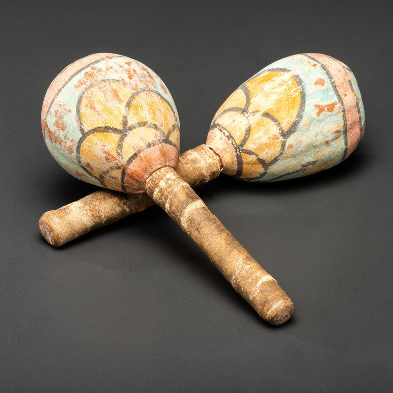 pair of matching gourd rattles decorated with mineral paint in a muted pastel palette with weather related imagery