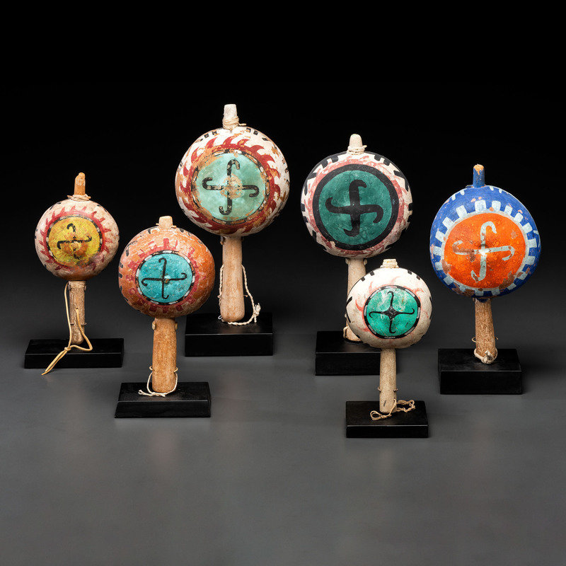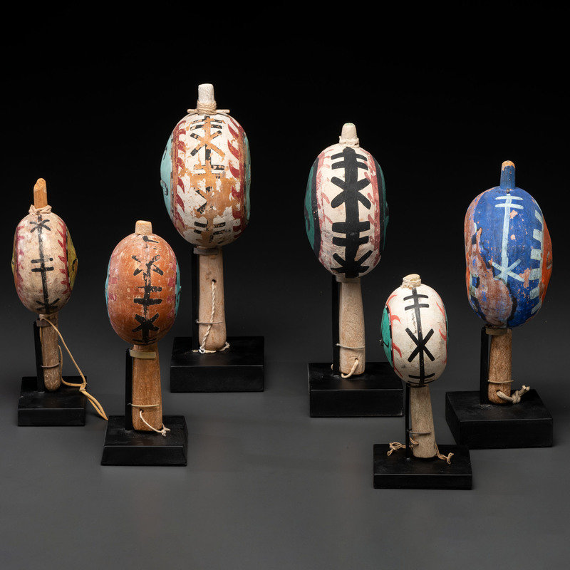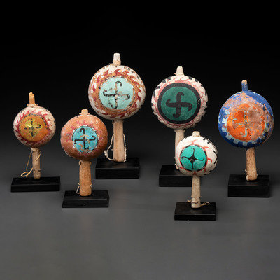 lot of six, includes rattles decorated with whirling logs having mineral and commercial pigments; largest height 12 in.