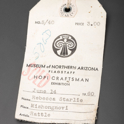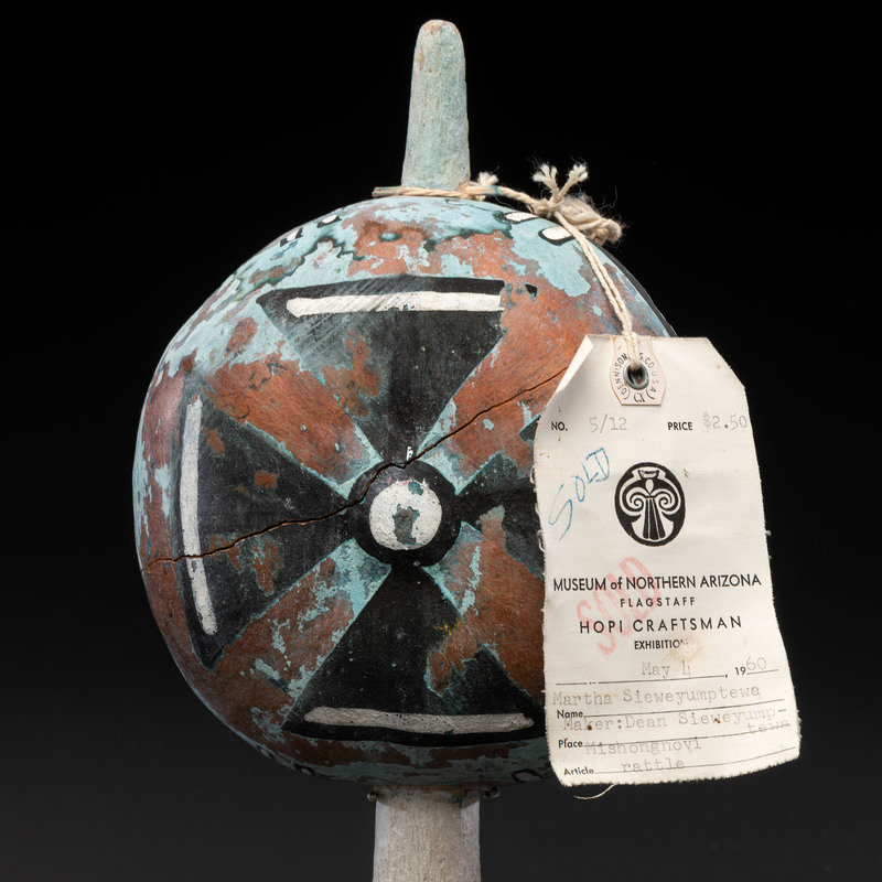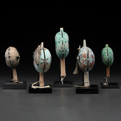 lot of 5 rattles painted in an analogous range of blue and green; two with tags from the Museum of Northern Arizona Hopi Craftsman Exhibition, one made by Martha Sieweyumptewa and the other by Rebecca Starlie