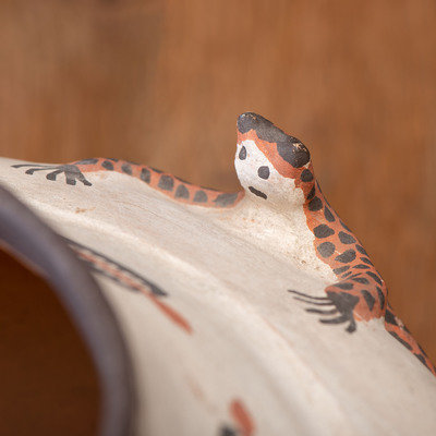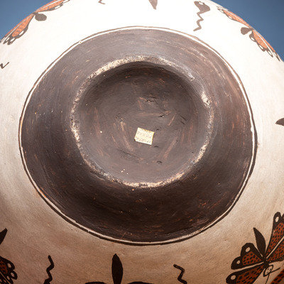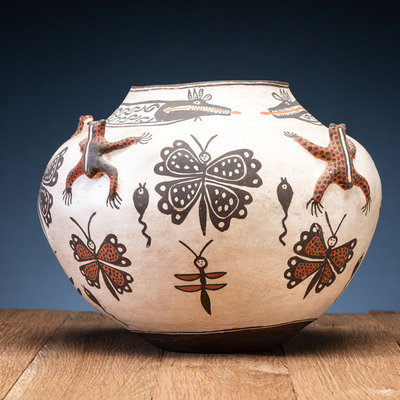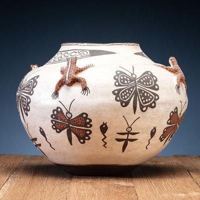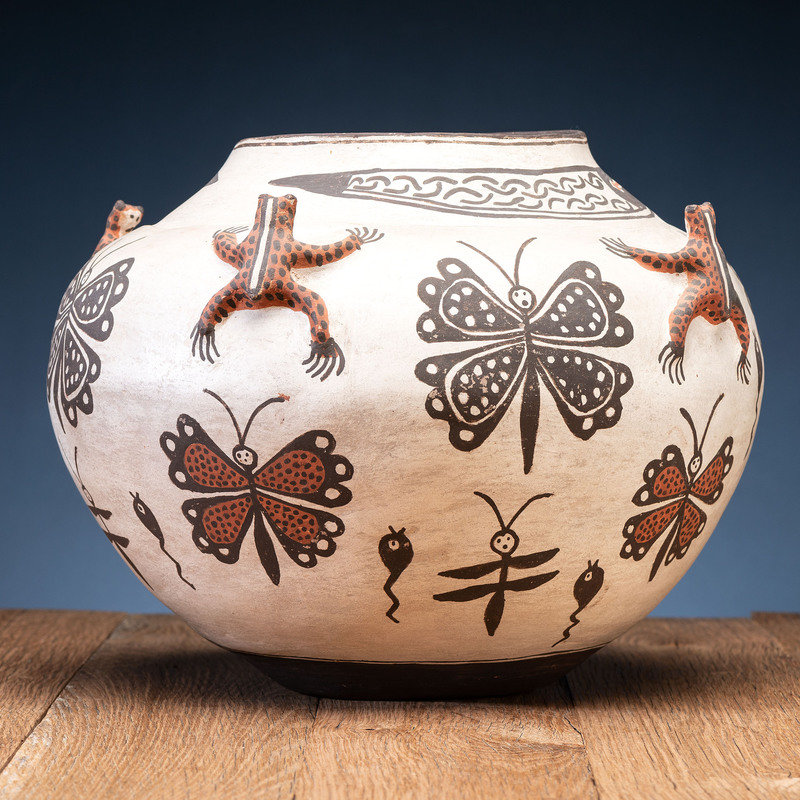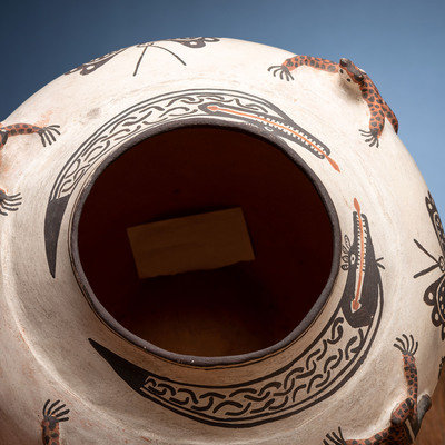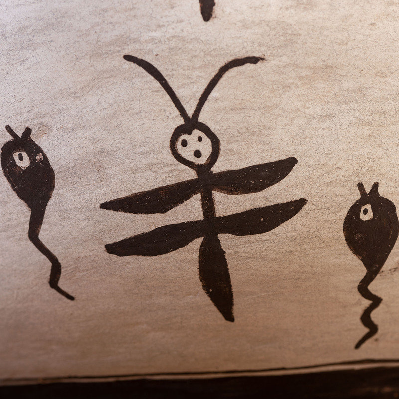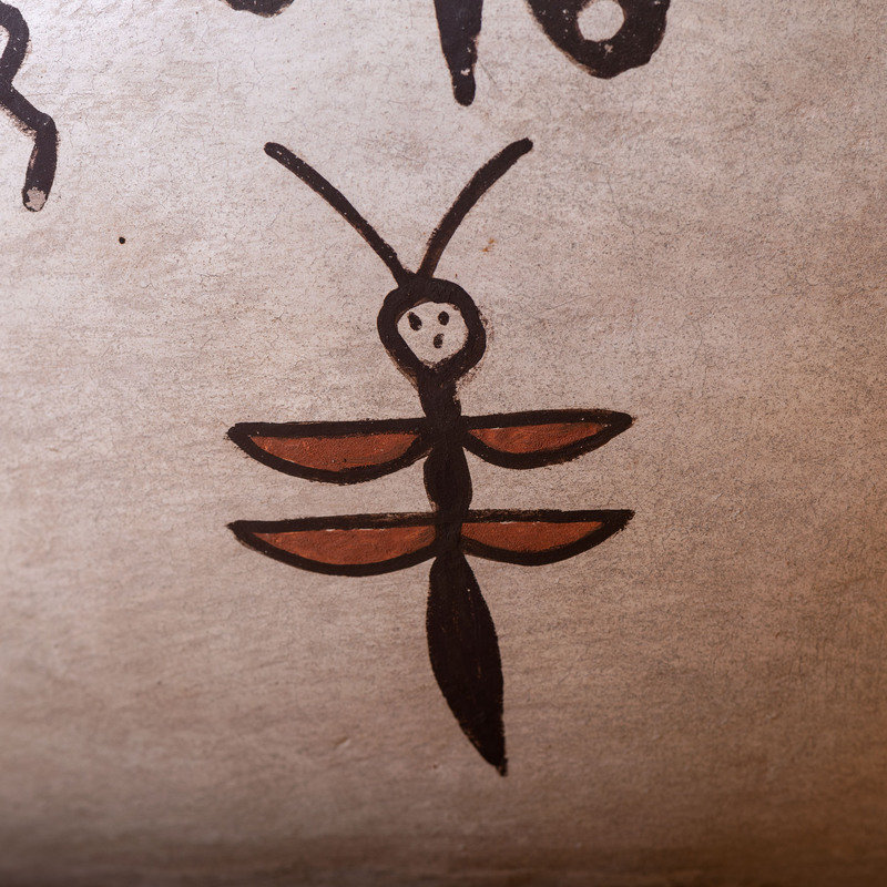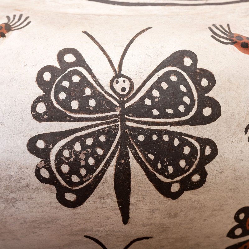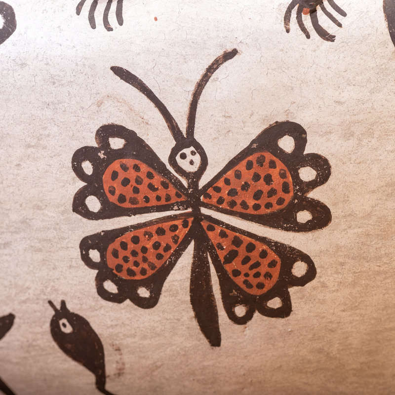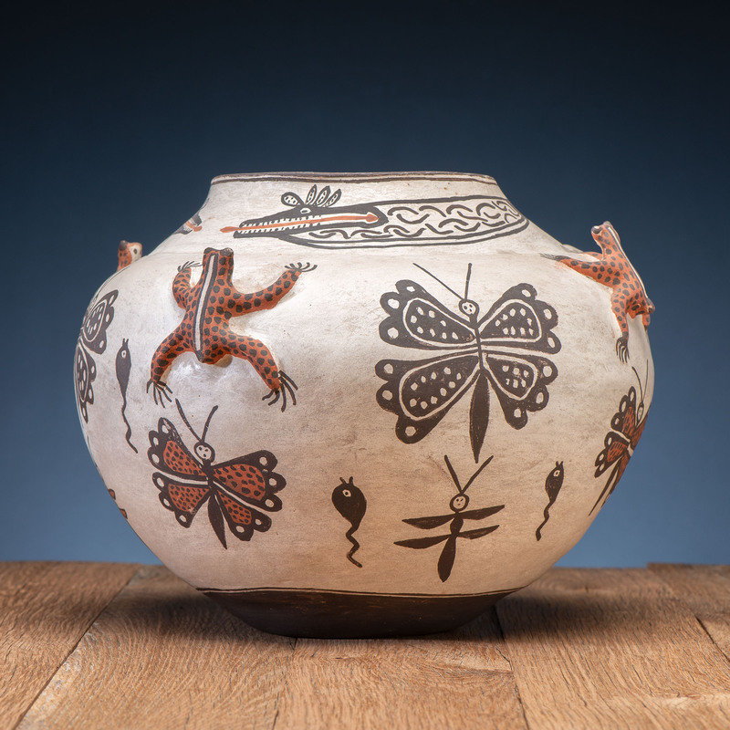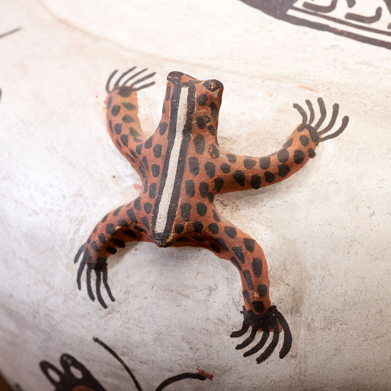 decorated with frogs in relief, some having remnants of green paint; butterflies, tadpoles, dragonflies, and Kolowisi are on body