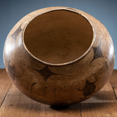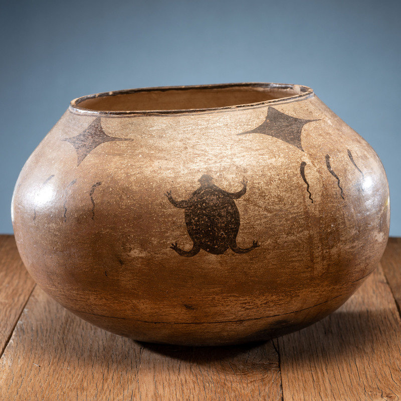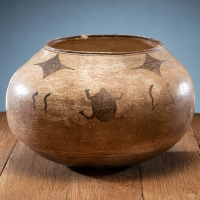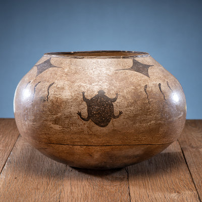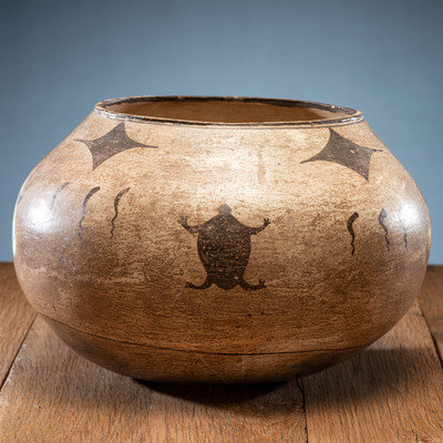 globular form with slight lip to rim; painted with imagery of frogs, tadpoles, and elongated stars
