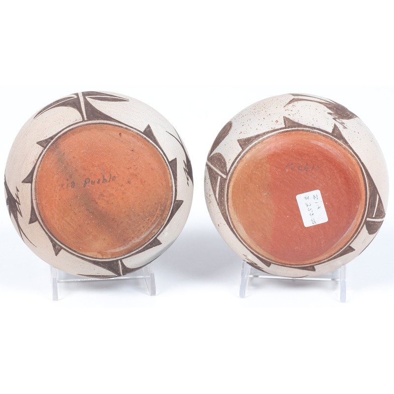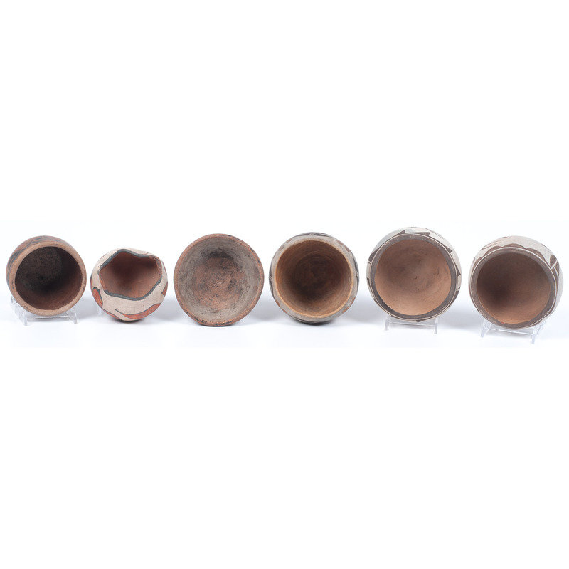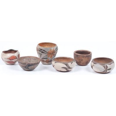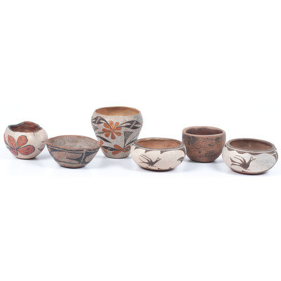 lot of 6, includes a matched pair of Zia bowls, each decorated with birds, height 2.25 in. x diameter 5 in.; PLUS an Acoma jar with floral designs, height 4.25 in. x diameter 4.5 in.; PLUS three Kewa jars, height 2 in. x diameter 4.75 in.; height 2.75 in. x diameter 4.25 in.; AND height 2.75 in. x diameter 4 in.