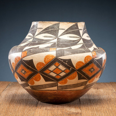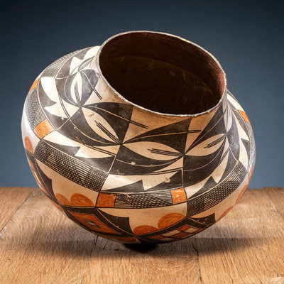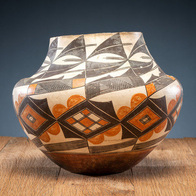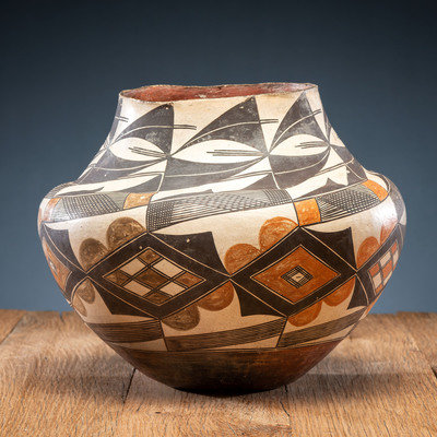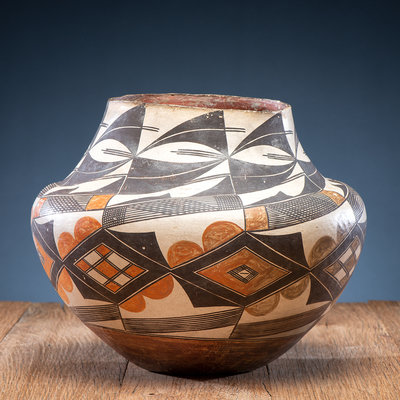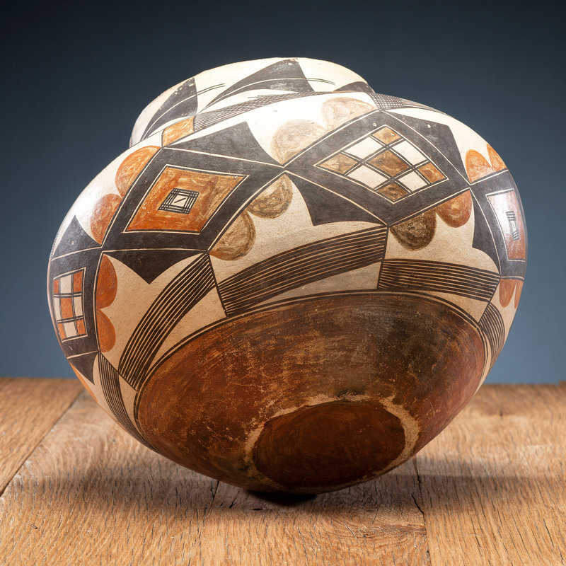 with sharp shoulder and elongated neck; horizontal friezes of nesting diamonds and split leaf elements
