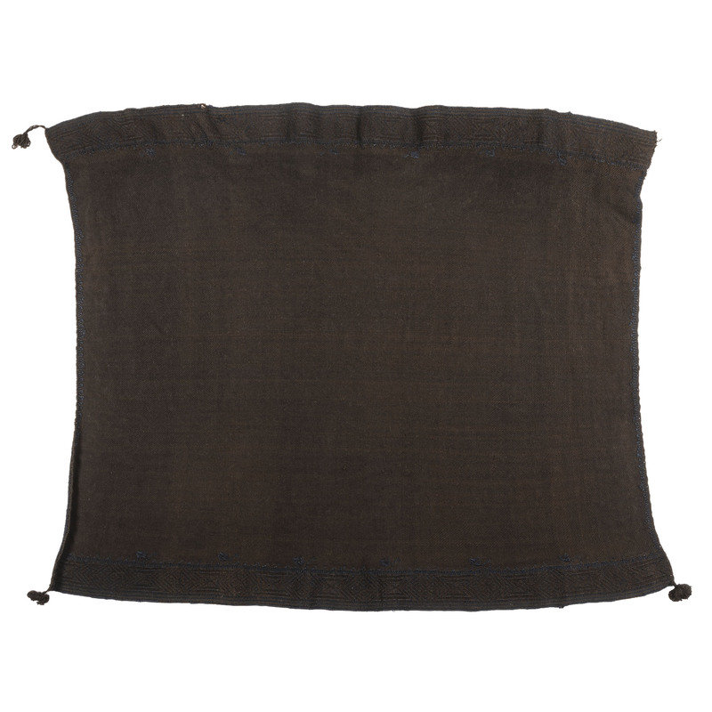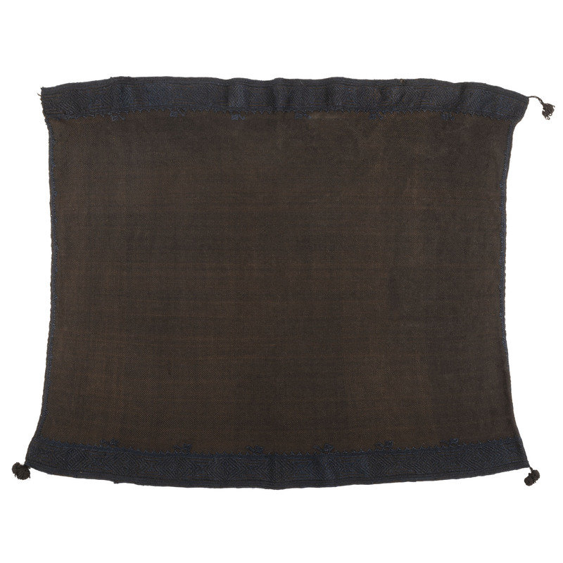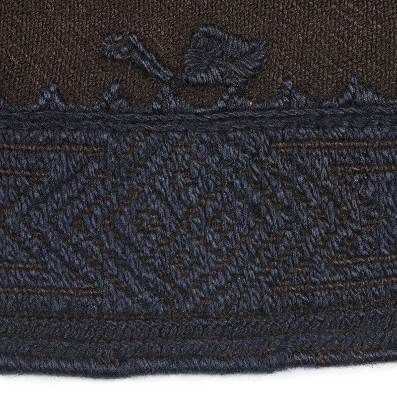 having a deep brown twill wool center; borders embroidered with indigo and incorporates swallowtail butterfly, diamond elements, and accents of tulips