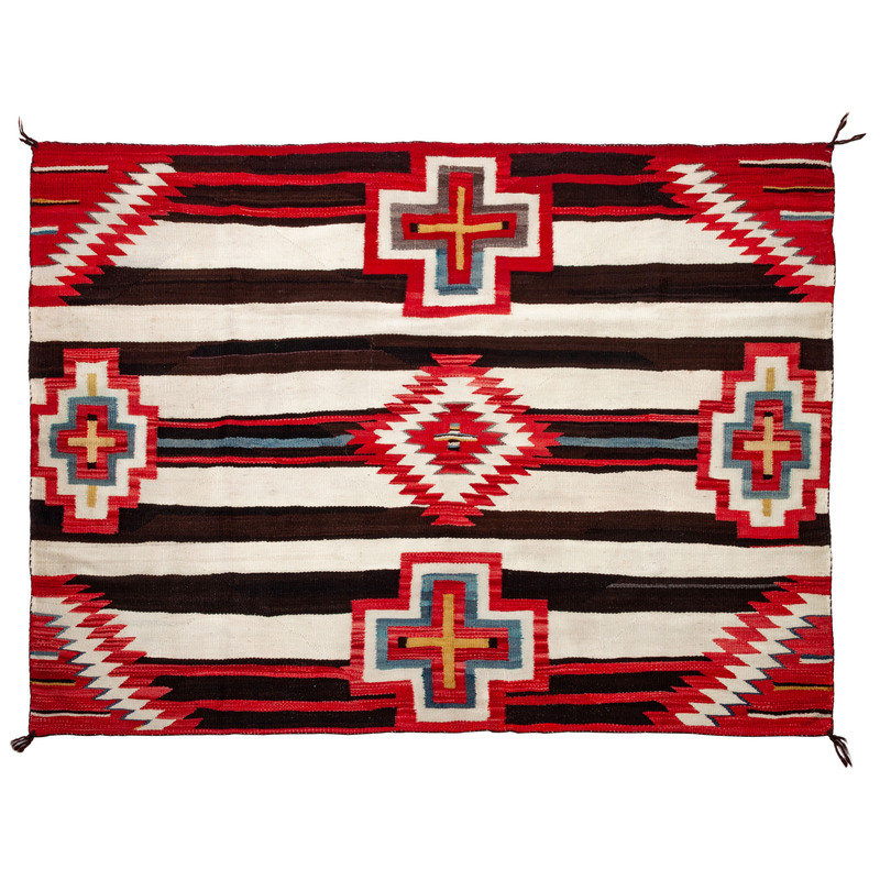 hand-spun wool woven in red, cream, brown, gold, and slate