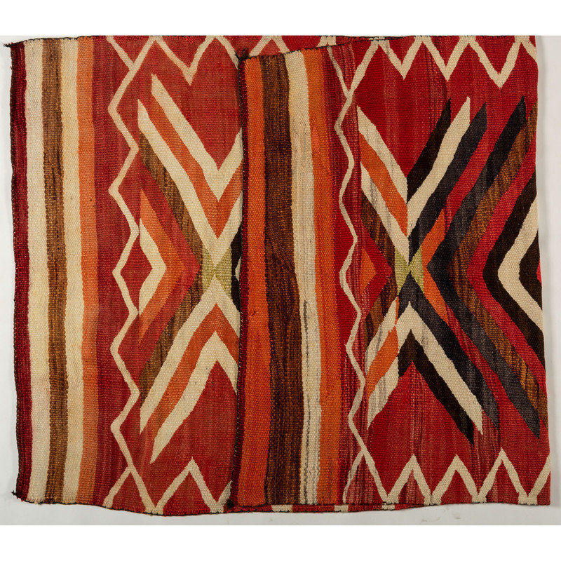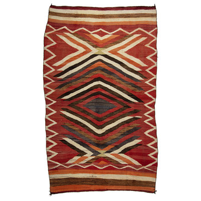 woven in a colorful palette of red, orange, cream, brown, and grey