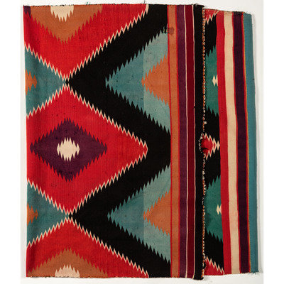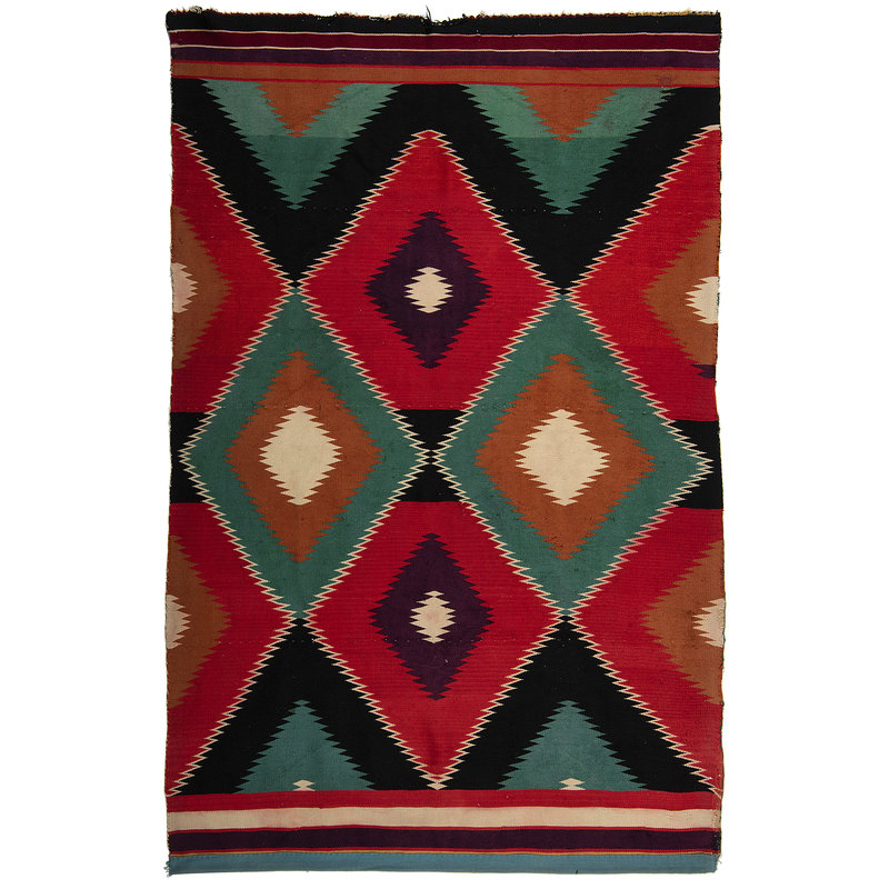 woven in colors of black, white, turquoise, red, purple, maroon, tan, and yellow; with outlined serrated diamonds