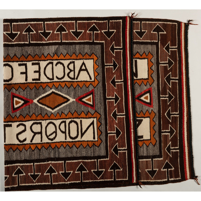 hand-spun wool woven in colors of browns, cream, and orange; designed with a border of arrows and the alphabet placed in two rows