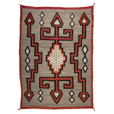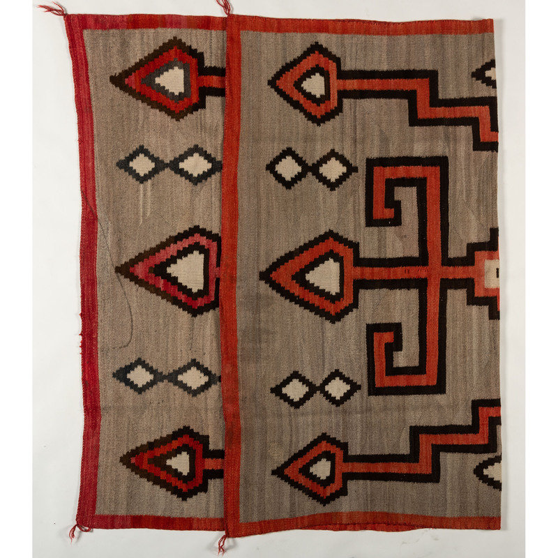 hand-spun wool woven using colors of red, dark brown, gray, and cream; with a bold, "deconstructed" storm design