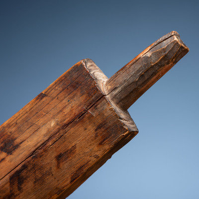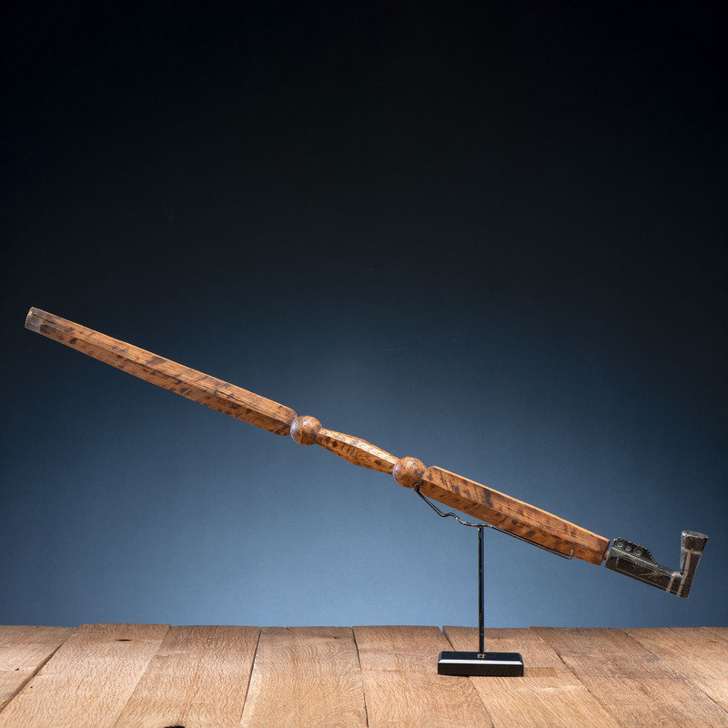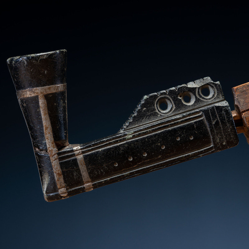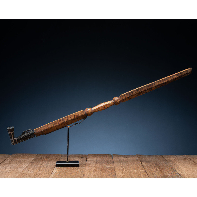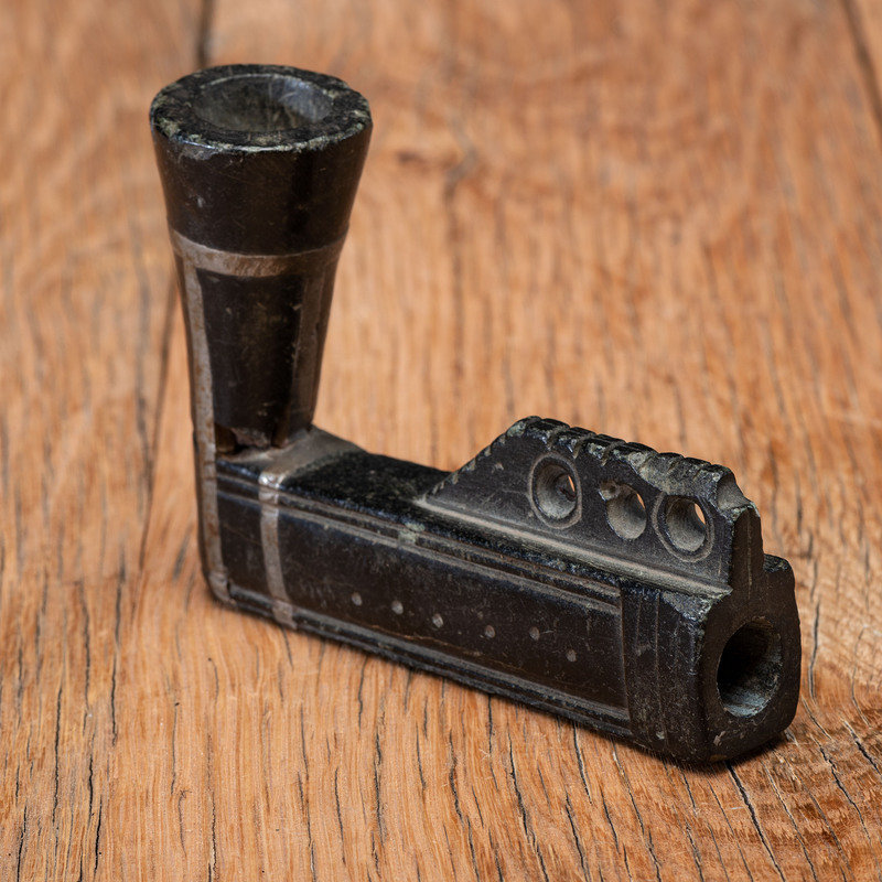 locomotive-style steatite pipe bowl; having lead inlay, incised decorations, and pierced crest, length 4 in. x height 3 in.; with a long stem having a beveled and file-branded surface, length 32.5 in., overall length 35.5 in.