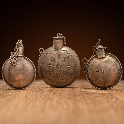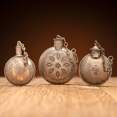 Navajo Stamped Silver Tobacco Canteens, with Thunderbird Designs