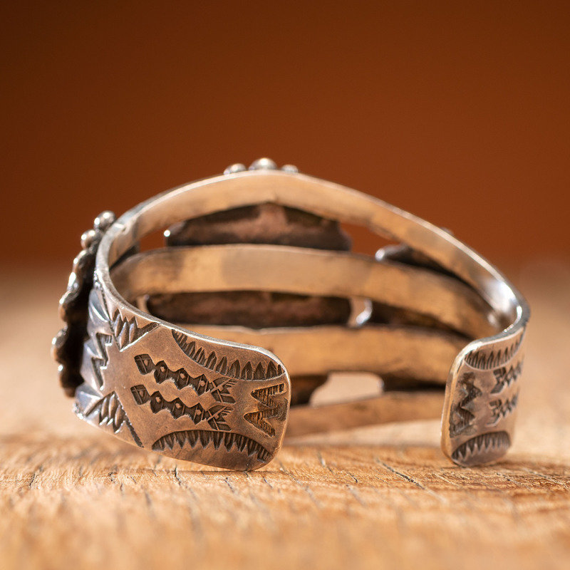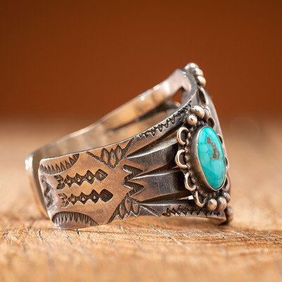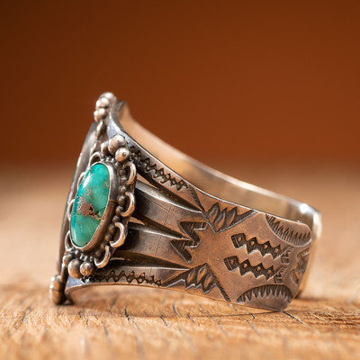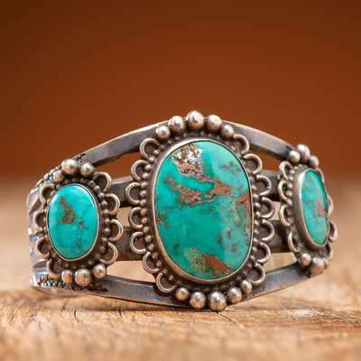 stamped silver cuff set with three turquoise cabochons in scalloped bezels; not marked