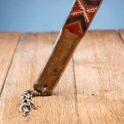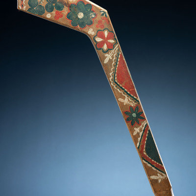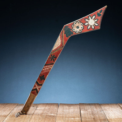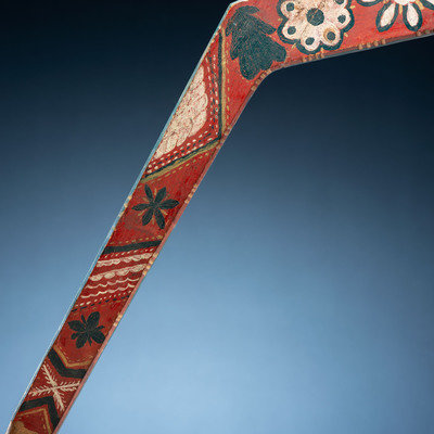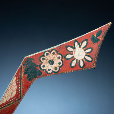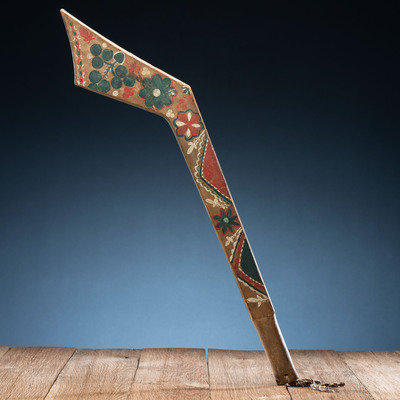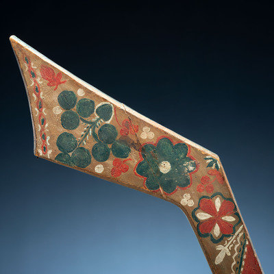 having traditional form and embellished with notched edges; painted on both sides with floral patterns using colors of red, cream, gold, and white