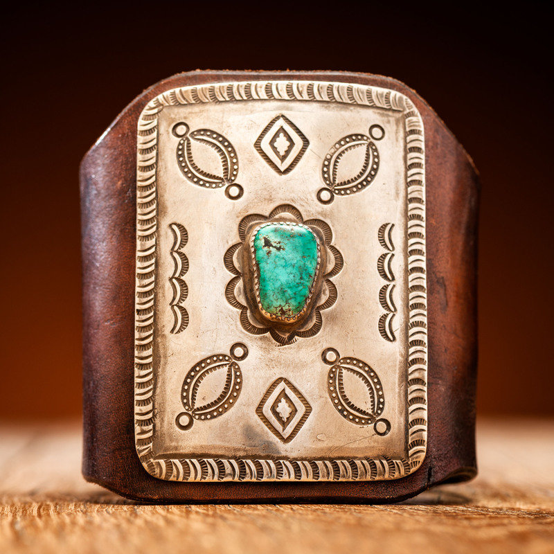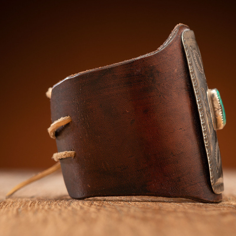 stamped and chiseled rectangular-shaped silver concha set with a central singular turquoise cabochon; rich brown harness leather cuff; not marked