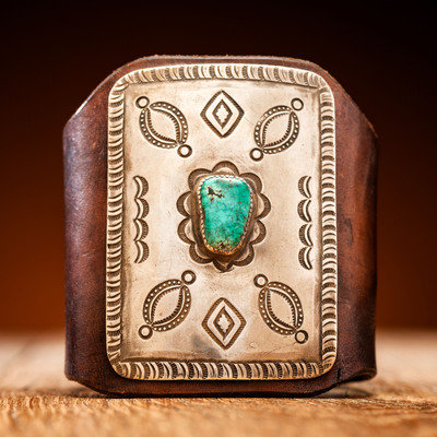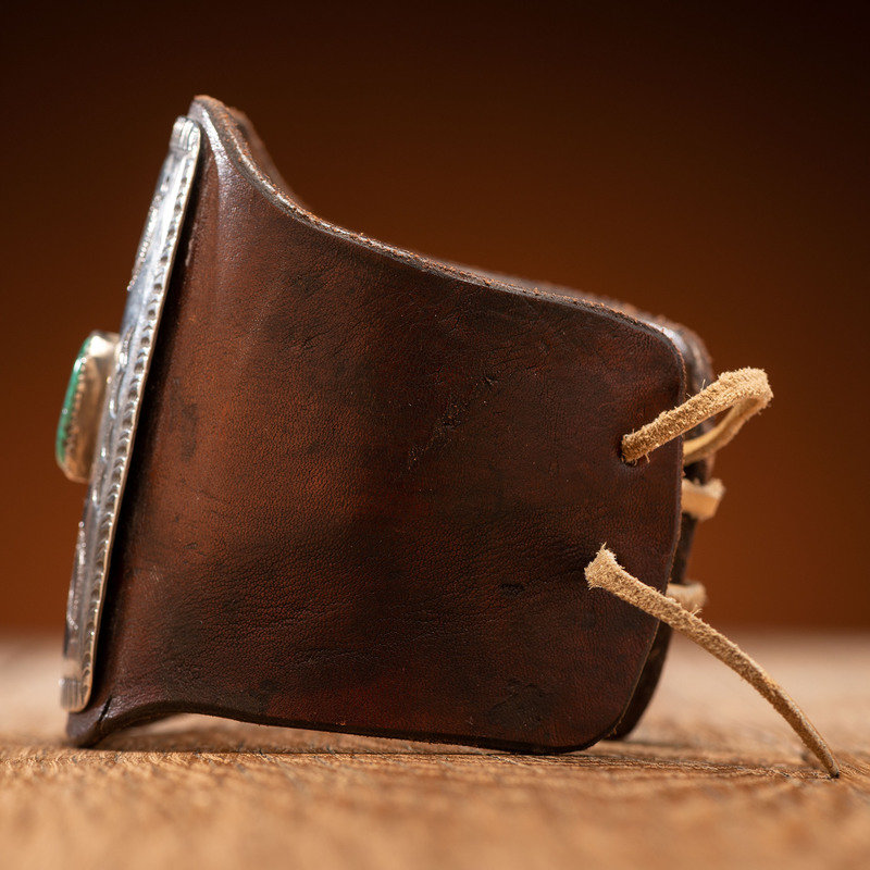 leather cuff length 8.75 in. x width 3.5 in., concha length 3 in. x width 2.25 in., weight 55.1 dwt.