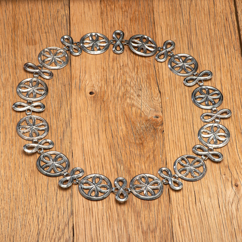silver links alternate between round conchas and slender butterflies; guild hallmark on buckle