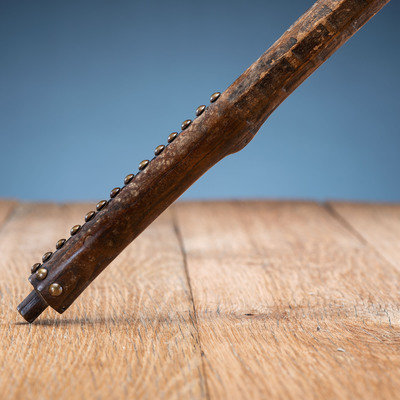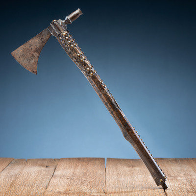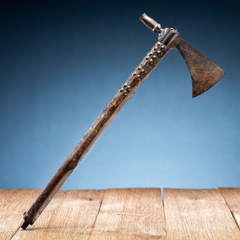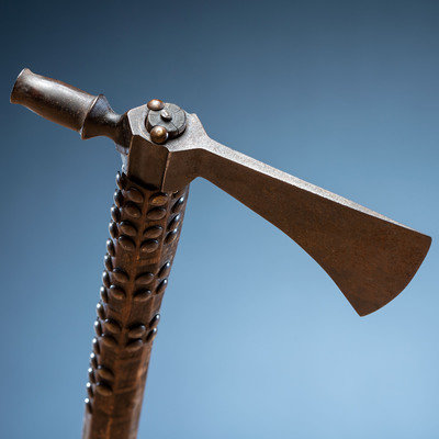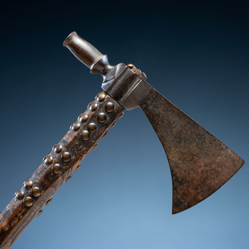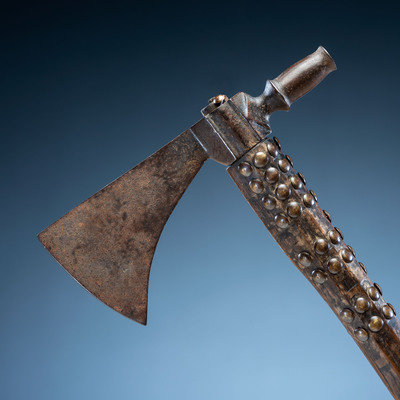 beveled haft having a file-branded surface and studded with approximately 85 brass tacks; blade with a heavy hook and tall, tulip-shaped bowl; length of head 6.75 in. x width of blade 2.75 in.