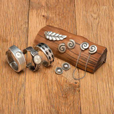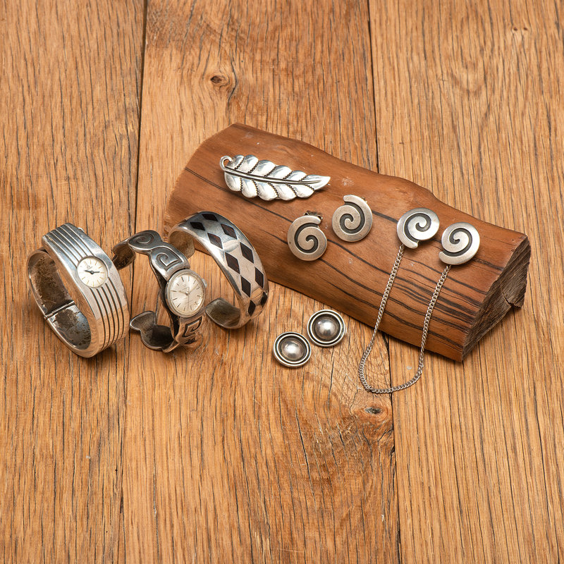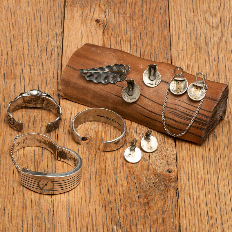 lot of 7, includes matching silver cuff watchband, clip earrings, and sweater clip, all with swirling wave design; all marked with the White Hogan shop mark, KB for artist Kenneth Begay (Dine 1913/1914-1977), and STERLING