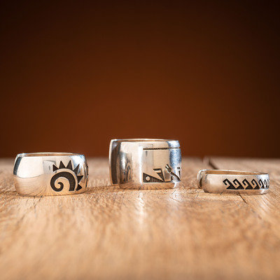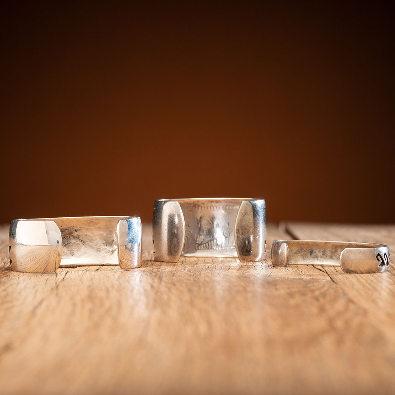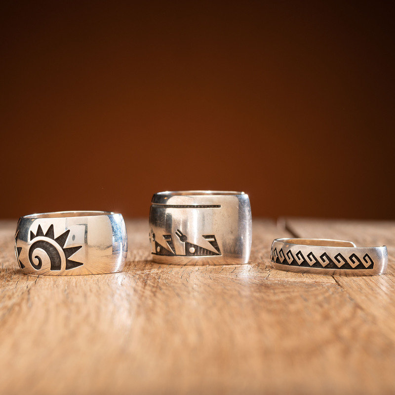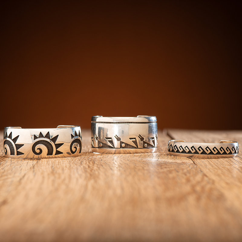 lot of 3, includes a cuff with geometric designs; marked with artist's hallmark and the Hopicrafts shop mark