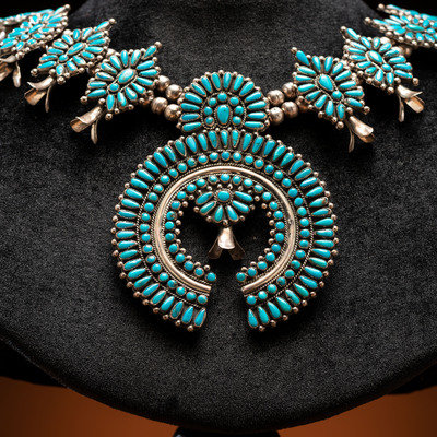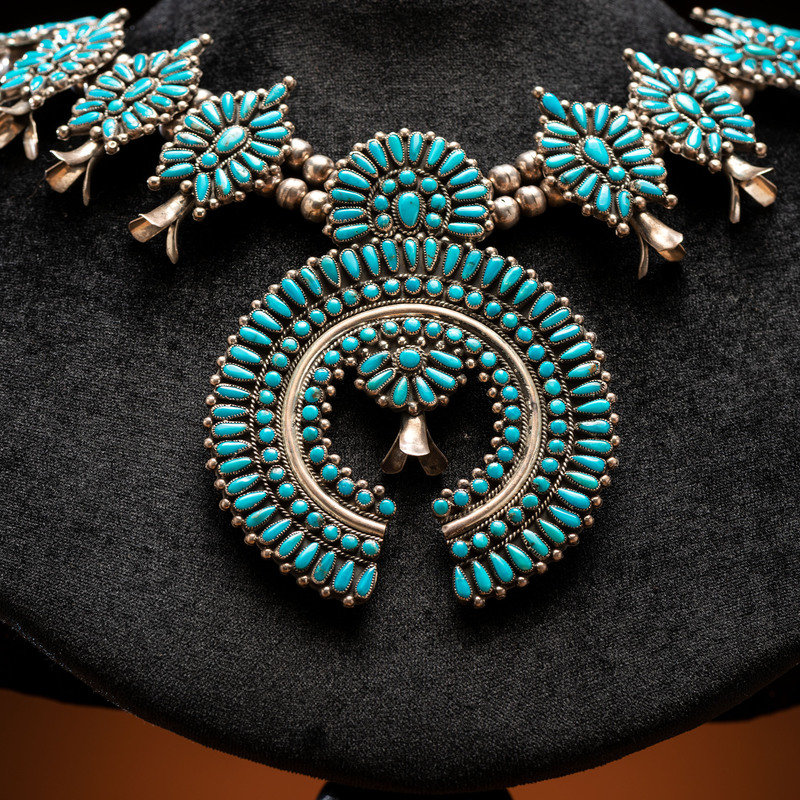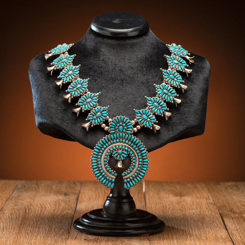 Victor Moses Begay (Dine, act. since 1950s) Silver and Petit Point Turquoise Squash Blossom Necklace