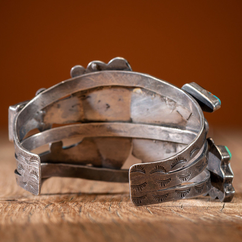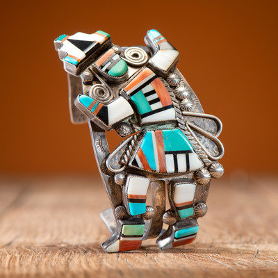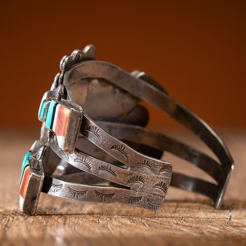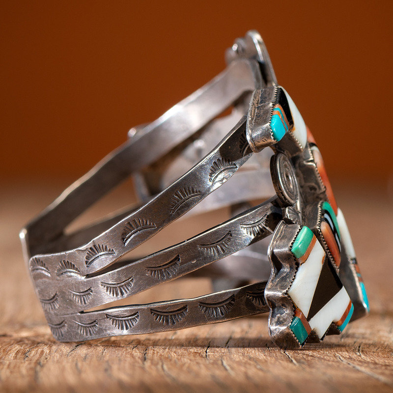 stamped silver cuff featuring a Rainbow Man inlaid with turquoise, shell, jet, and spiny oyster; not marked