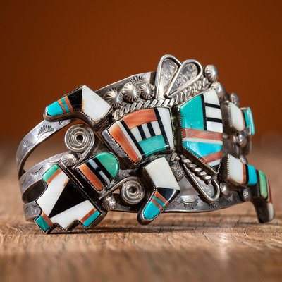 Zuni Silver Cuff Bracelet, with Mosaic Inlay Rainbow Man