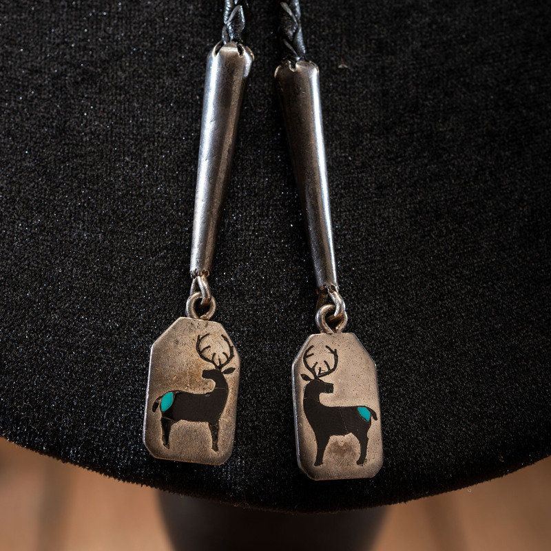 heartline deer and thunder cloud silver slide inlaid with turquoise, jet, spiny oyster, and coral; braided black leather cord having tapered silver endcaps, each with a silver pendant with jet and turquoise deer; not marked