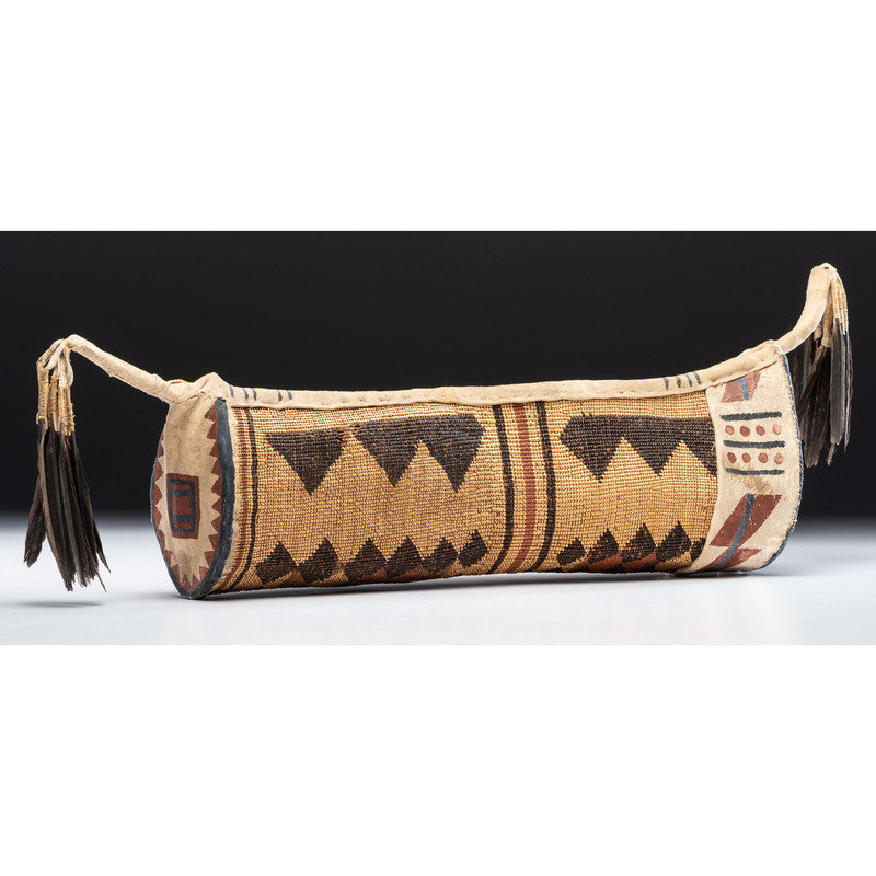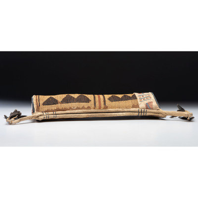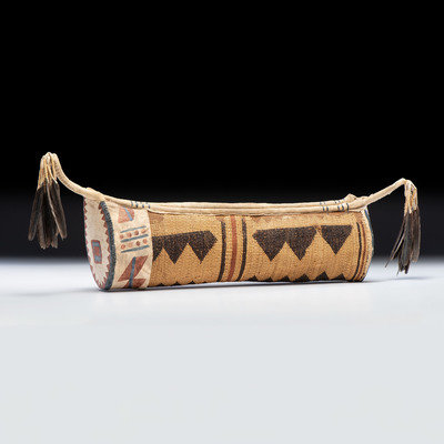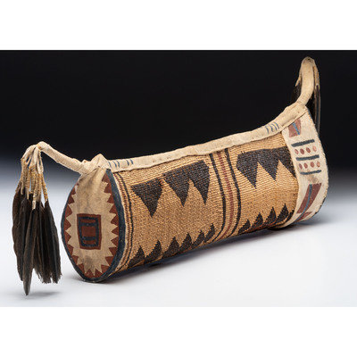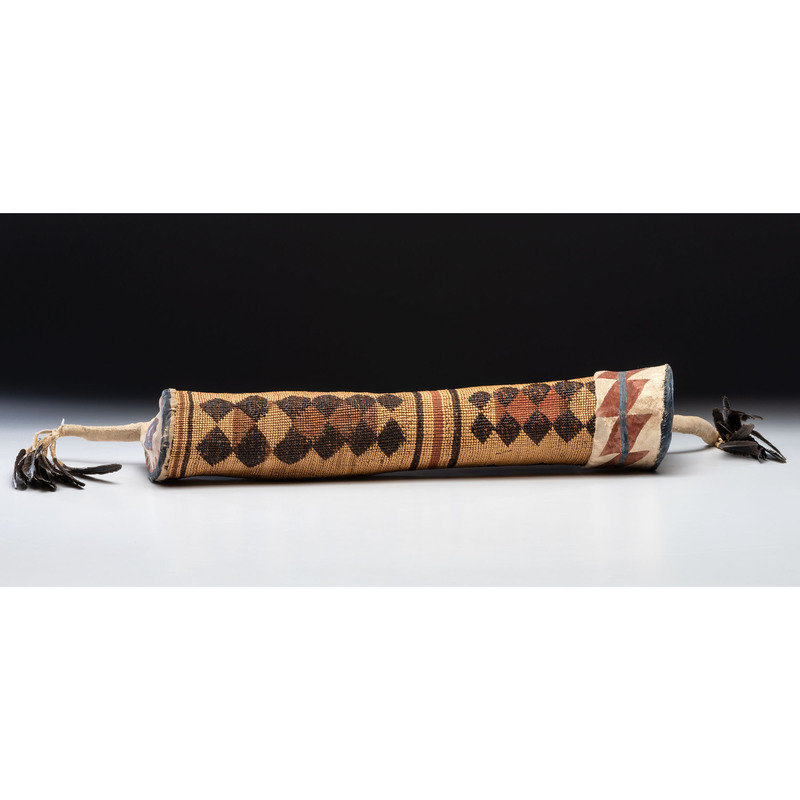 elongated form with wood rod foundation and capped with blue and red painted deer hide