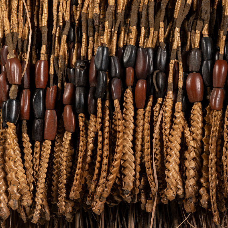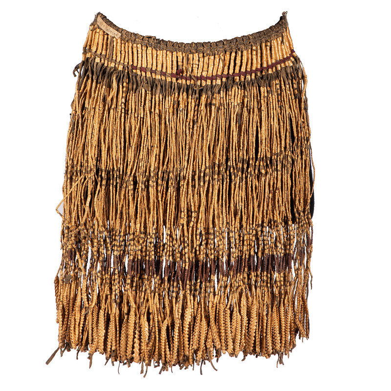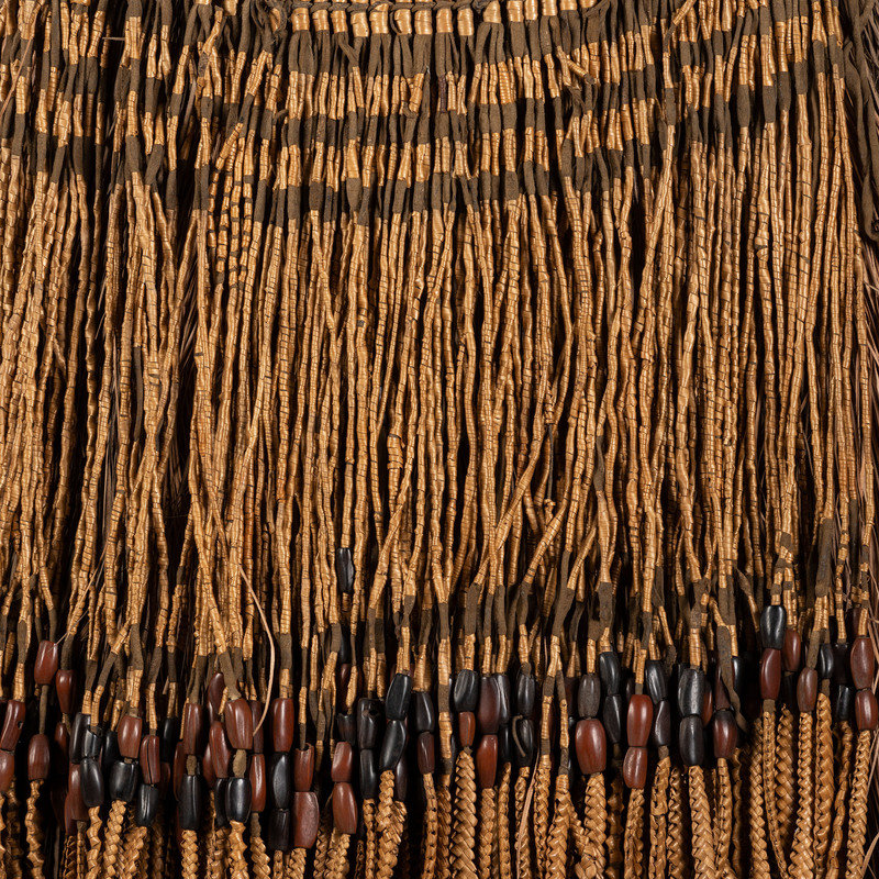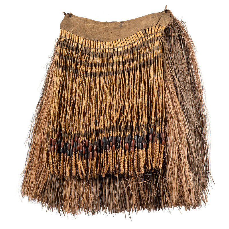 lot of 3, includes a grass skirt alternating in colors of beige and gray-green; braided raffia ties, width 25 in x length 20 in.; PLUS two aprons, one with thick, softly tanned hide upper; both with skirt constructed of hide thongs, wrapped and braided bear grass; and pine seeds; "Sister Rebecca" sewn to interior of aprons; lengths 16 in. and 17 in.