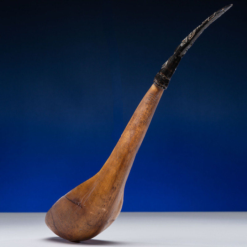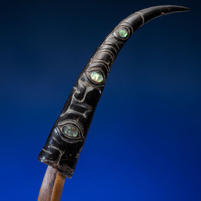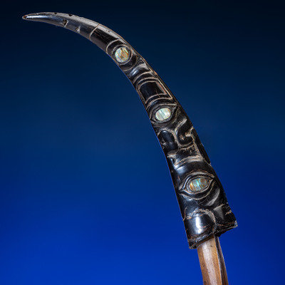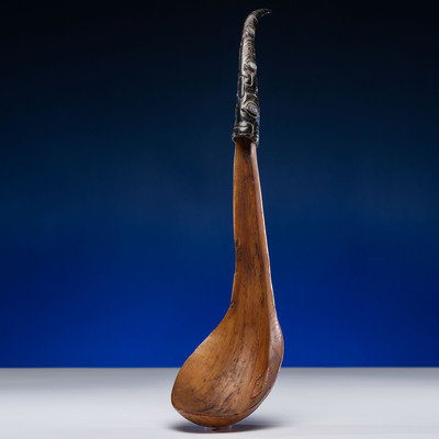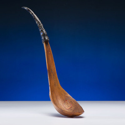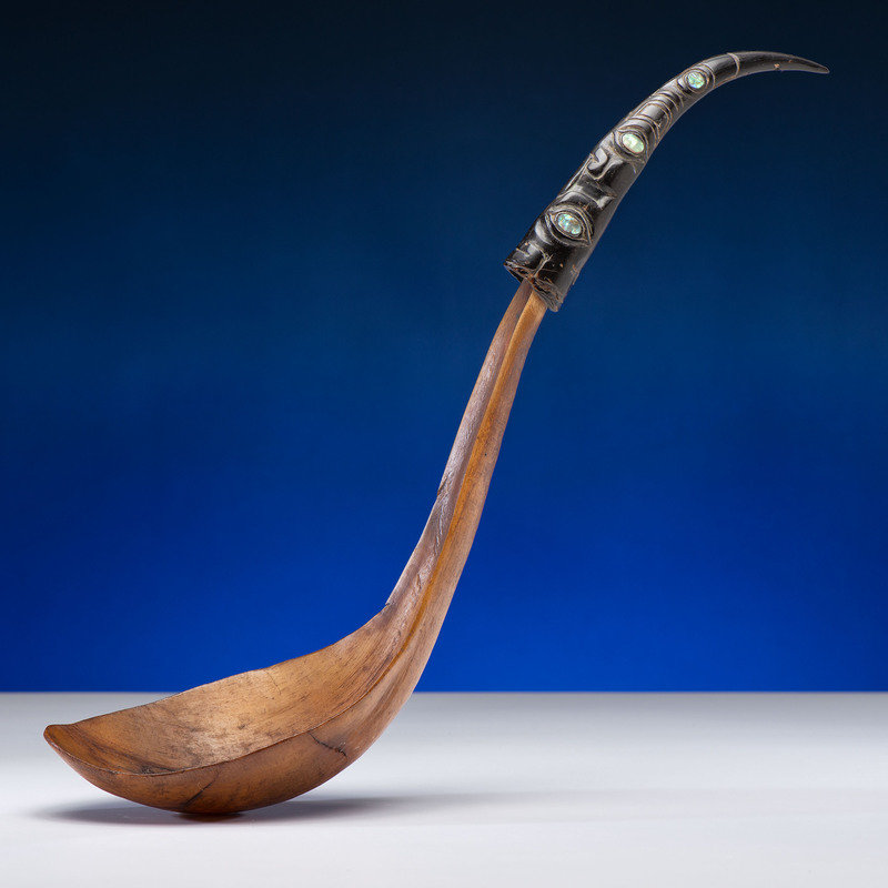large form two-piece ladle, deep scoop made of sheep horn and handle carved of goat horn; totemic imagery with abalone inlay; manuscript label: Ceremonial or Feast Spoon. Chilkat Indians Alaska. Capt. Healy's Collection. Exh. World's Fair. Chicago 1890. #1-AYYX, length 19.75 in.