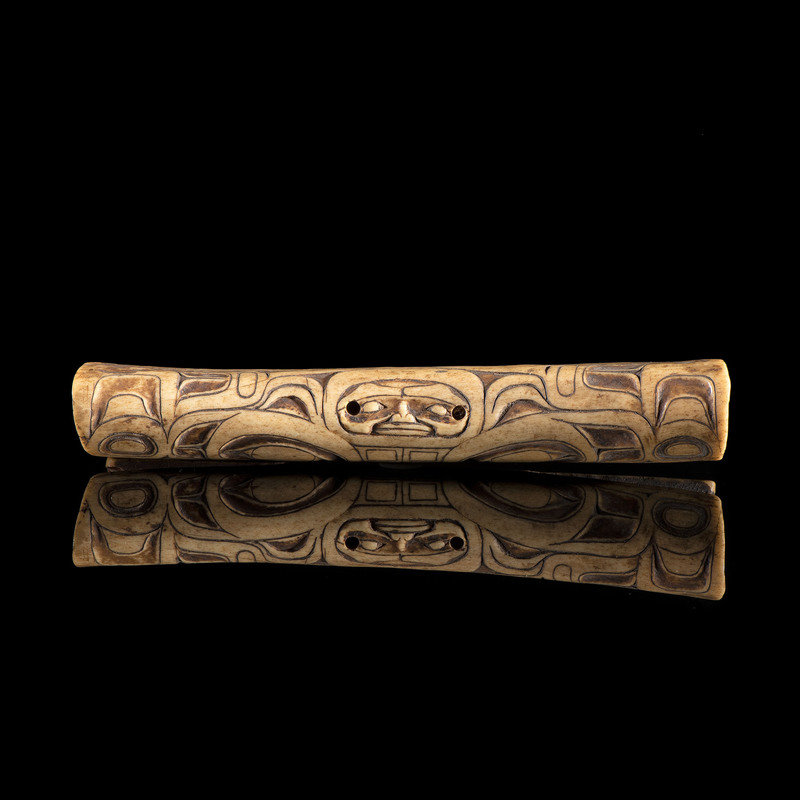 Soul Catchers are an important subcategory of amulets. Hollow cylinders that are carved in relief and pierced through for suspensions, almost all are made of bone, which is often said to be the femur of a bear. Those made of bone are now thought to have been made only by the Tsimshian (Holm, 1983, p. 119, no. 203), but were used by the Tlingit, Haida, and Bella Bella as well....