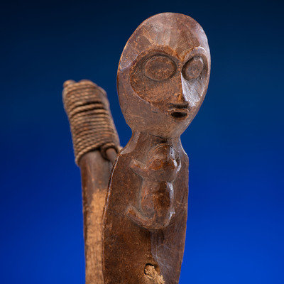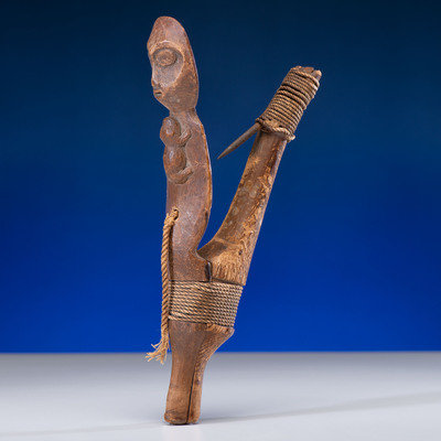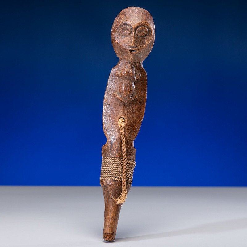 heavily used hook with carved imagery of a singing human figure, frog on chest; cotton cord wrapping; iron hook