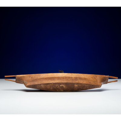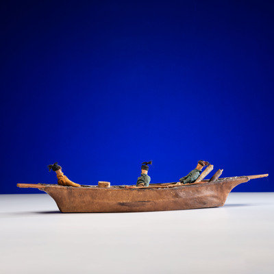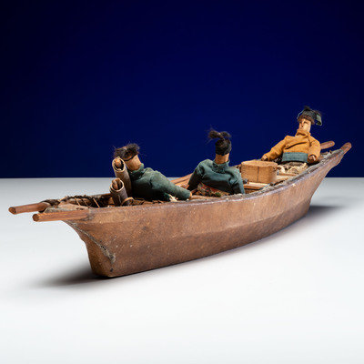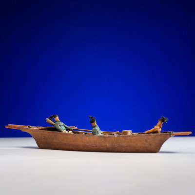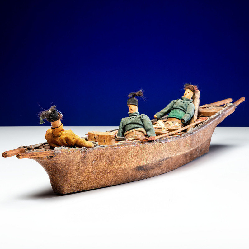 wood frame covered with walrus skin; three rowers dressed in cotton clothing and sealskin boots; umiak fully stocked with harpoons, oil lamps, ulu, and other assorted equipment