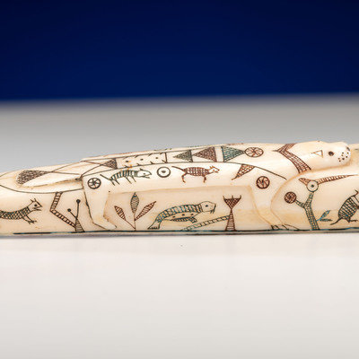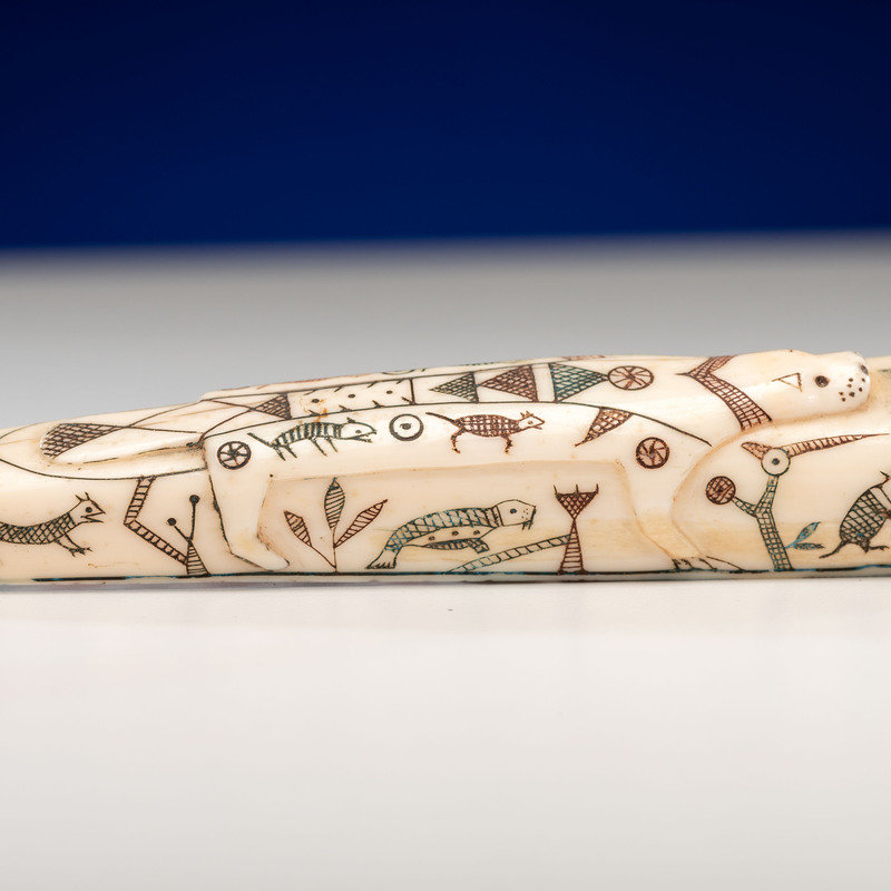 carved into the form of a swimming seal with a seal carved in relief on his back; colorfully painted vignettes of arctic animals and geometric designs decorate the stem and bowl