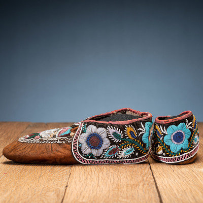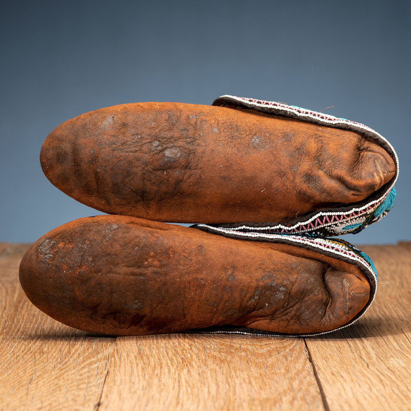 thread-sewn on smoke tanned hide; vamps and cuffs lined with velvet and beaded in a floral pattern