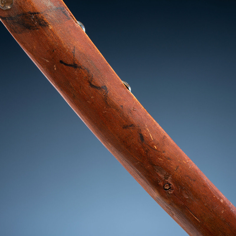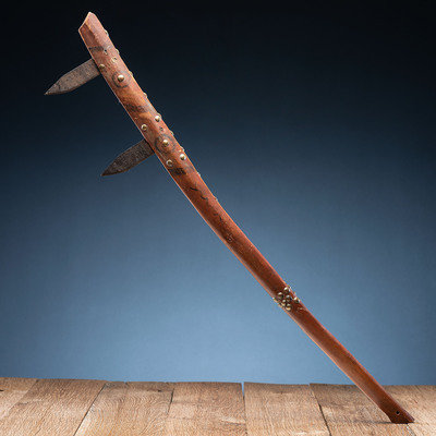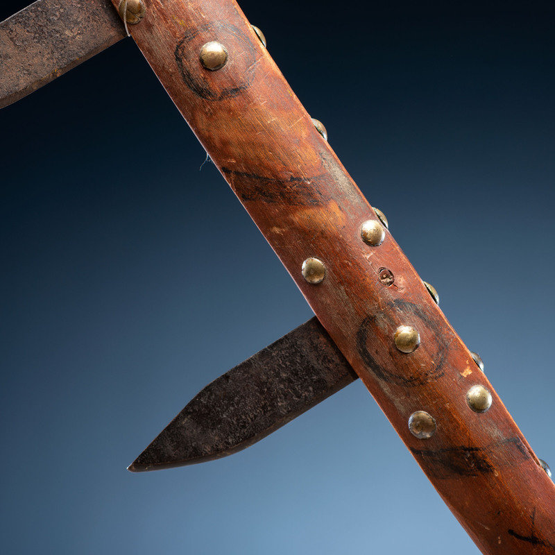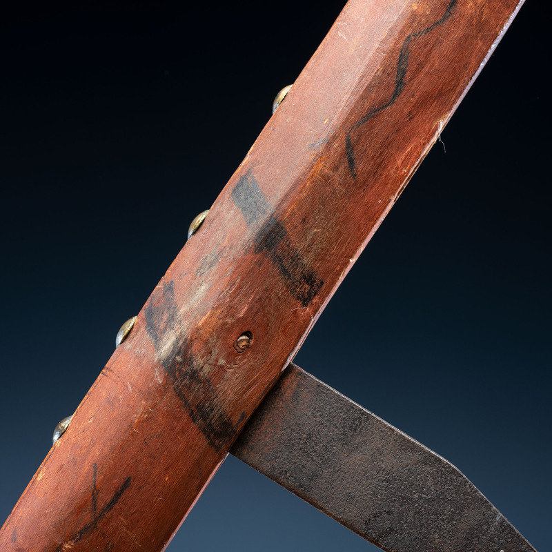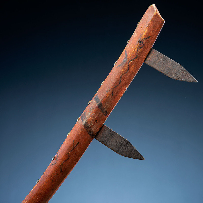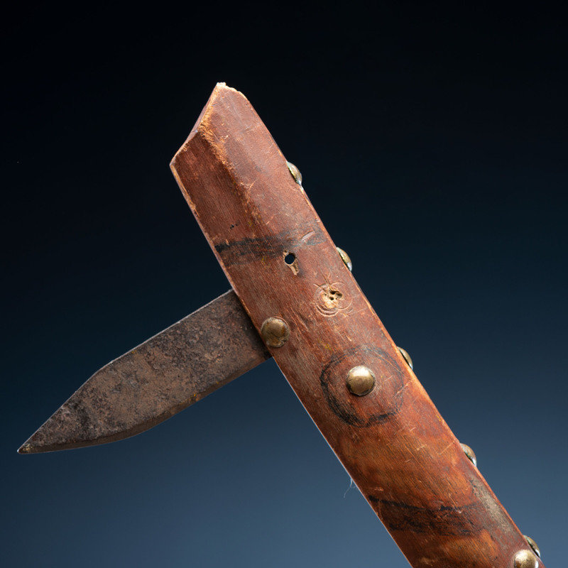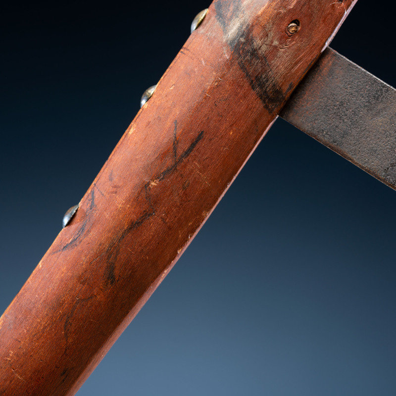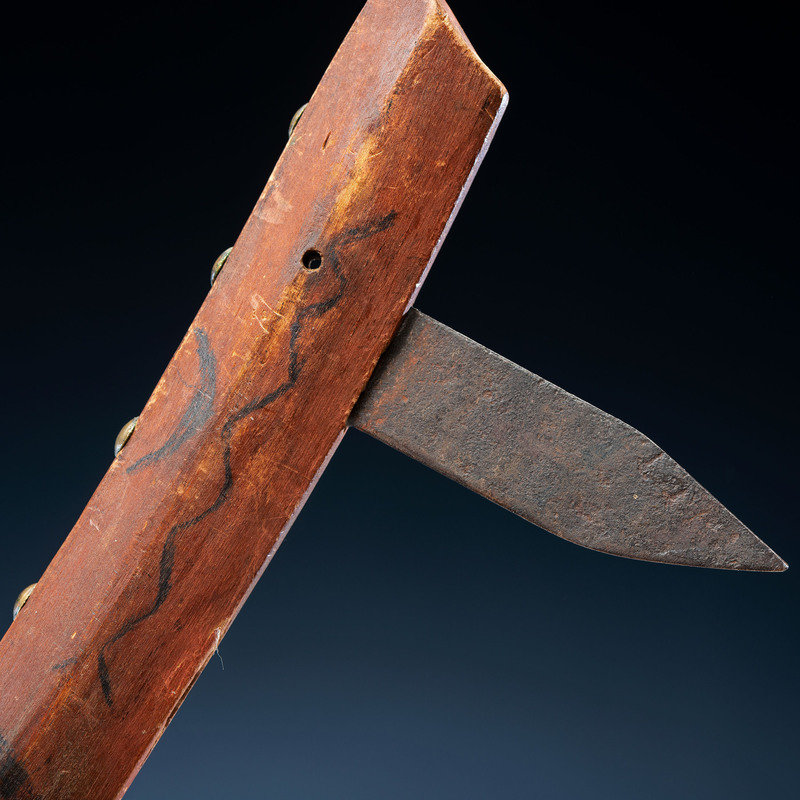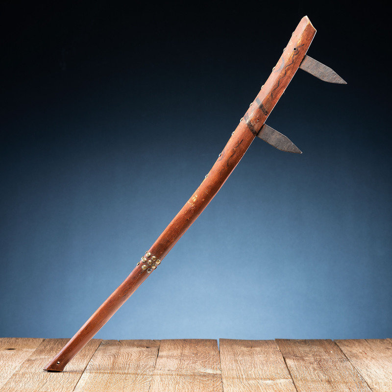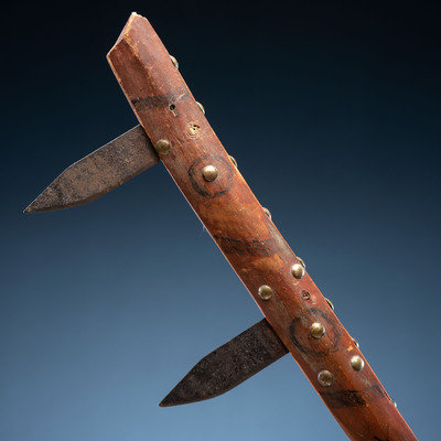 long wood handle decorated with a red wash and geometric elements in black; studded with 35 brass tacks and inset with spaces for three steel blades, only two blades remain